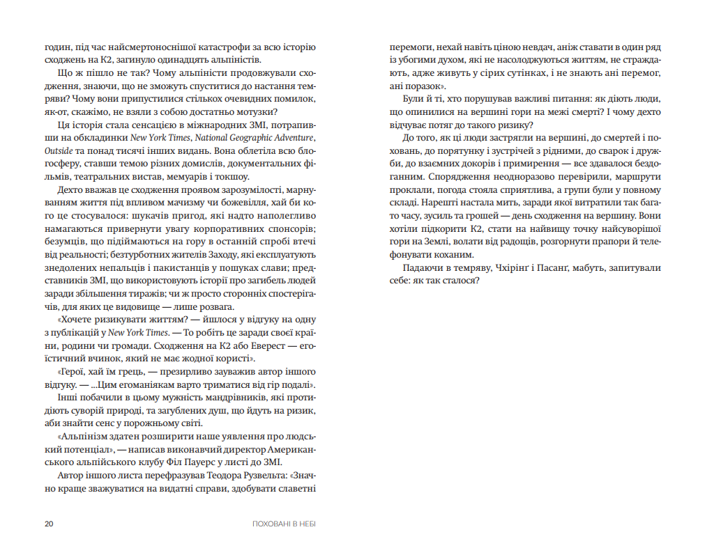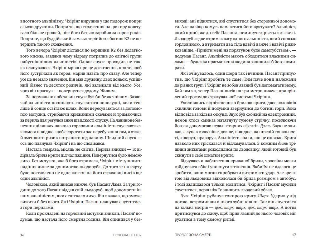 «Поховані в небі» — це яскравий текст, який реконструює одну з наймоторошніших трагедій в історії альпінізму і водночас розкриває звичаї та культуру шерпів, без яких годі уявити сучасні високогірні сходження.
