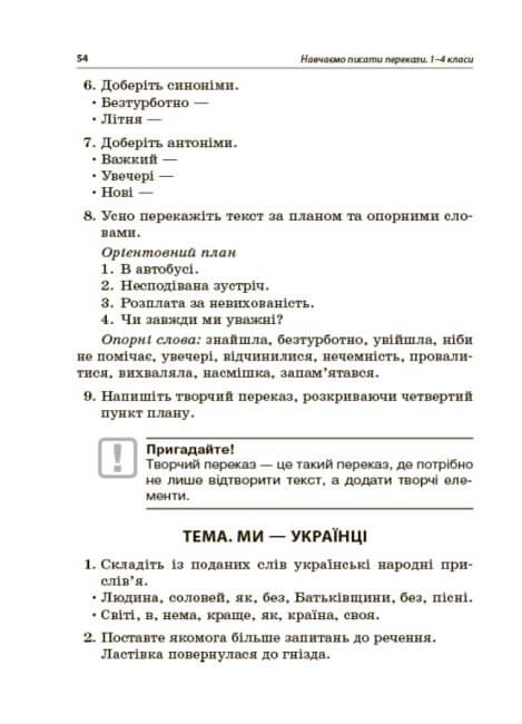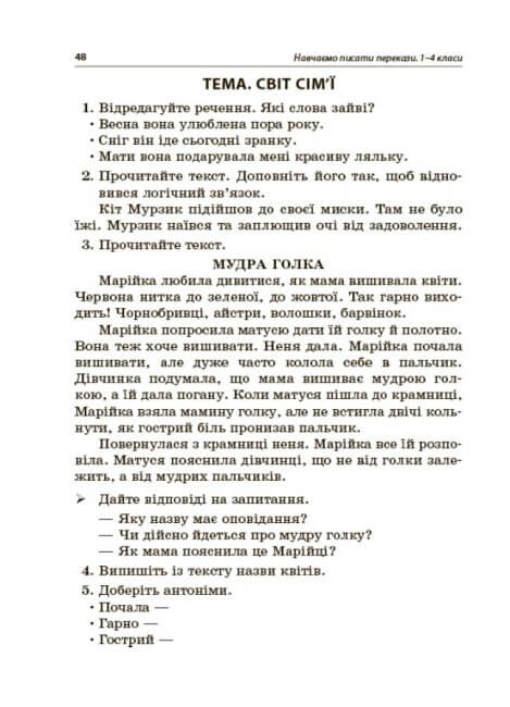 Робота над переказами має важливе значення у навчально-виховному процесі, як розвивальна форма усного й писемного мовлення. У посібнику наведено тексти переказів до 55 тем для 1-4-х класів НУШ, запитання до них, орієнтовні плани, а також вправи, спрямовані на вироблення граматичних навичок: дитина знаходить і виправляє різні лексичні та синтаксичні помилки.