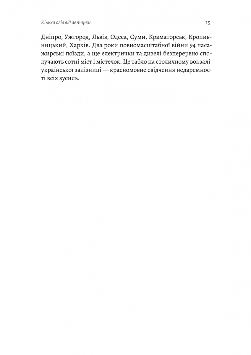 Ця історія починається з розкладу на центральному залізничому вокзалі столиці, де на електронному табло світяться жовтим назви міст, до яких поки що не їдять поїзди: Керч, Мелітополь, Донецьк, Маріуполь, Луганськ, Севастополь, Євпаторія. Але про них памʼятають і їх відвойовують. Залізниця першою після армії заходить на деокуповані території, на ходу ремонтуючи колії. Відповідає за безпеку перевезення перших осіб країн-союзників і світових зірок до нашої столиці. Рятує, дає прихисток, забезпечує армію і оборонну промисловість. Дарує надію і єднає.