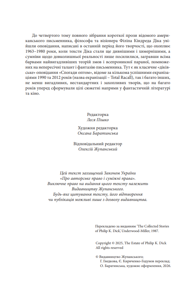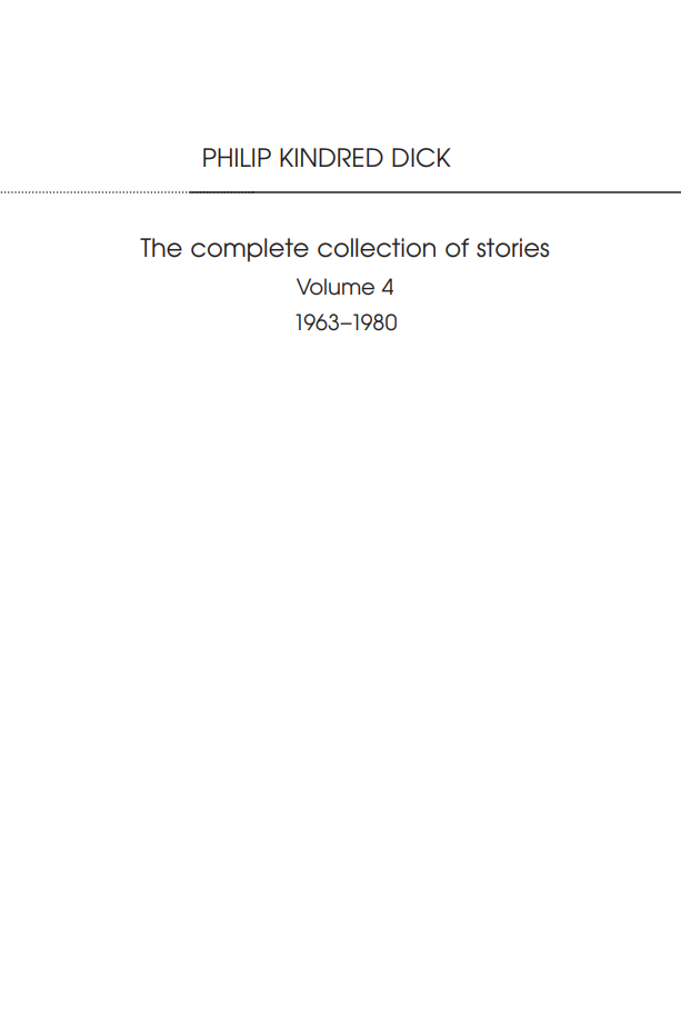 До четвертого тому повного зібрання короткої прози відомого американського письменника, філософа та візіонера Філіпа Кіндреда Діка увійшли оповідання, написані в останній період його творчості, що охоплює 1963–1980 роки, коли тексти Діка стали ще дивнішими і химернішими, а сумніви щодо довколишньої реальності лише посилилися, загравши всіма барвами найвигадливіших теорій змов і всепроникної параної, помножених на непересічні талант і фантазію письменника. Тут є як класичне «діківське» оповідання «Спогади оптом», відоме за кількома успішними екранізаціями 1990 та 2012 років (назва екранізації – Total Racall), так і багато інших, не менш вигадливих, нестандартних і захопливих творів, що на багато років уперед сформували цілі сюжетні напрями у фантастичній літературі та кіно.