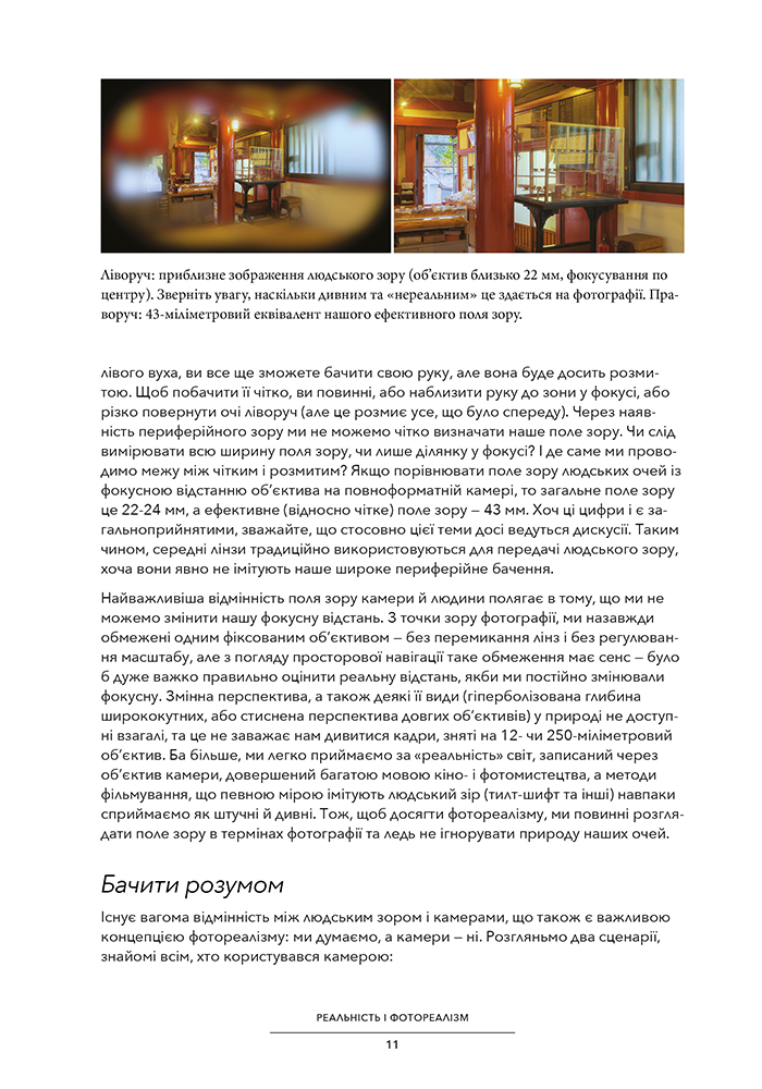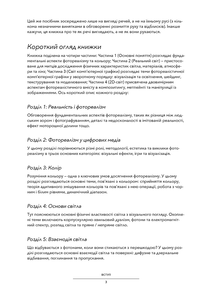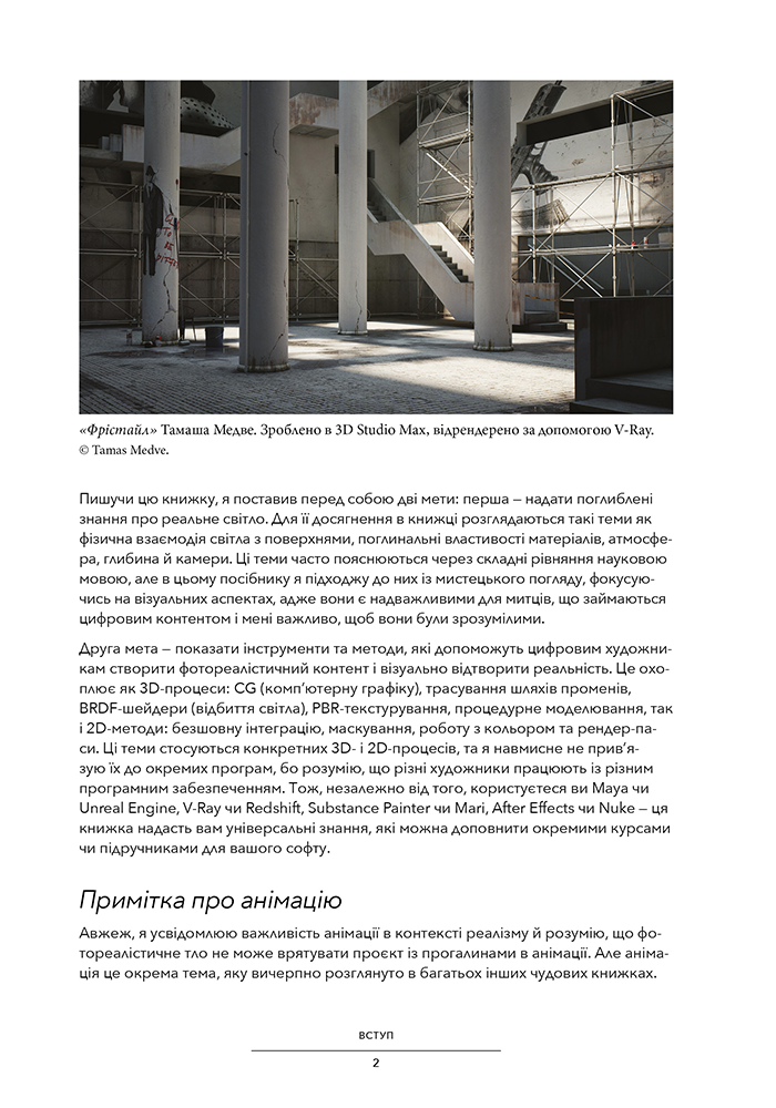 Книжка «Повний посібник із фотореалізму для візуальних ефектів, візуалізації та ігор» — ґрунтовний путівник зі створення й вдосконалення фотореалістичного цифрового контенту. Вона пропонує зануритися у фотореалізм за допомогою візуальних ефектів, візуалізації архітектурних об’єктів (архвіз), продуктів й ігор.Еран Дінур, володар нагороди «Еммі», керівник VFX, пропонує читачам глибше зрозуміти складну взаємодію між світлом, поверхнями, атмосферою й оптичними ефектами, обговорює методи досягнення фотореалістичної складності в цифровій сфері, охоплюючи методи як 3D-, так і 2D-просторів. Крім того, у книжці представлені ілюстрації, тематичні дослідження й інтерв’ю з провідними митцями у сфері VFX, візуалізації та ігор. Досліджуючи колір, інтеграцію, поведінку світла й поверхні, атмосферу, шейдинг, текстурування, фізично обґрунтований рендеринг, процедурне моделювання, композитинг, створення метпейнтів, ефекти об’єктива / камери та багато іншого, Дінур пропонує переконливий і елегантний посібник із досягнення фотореалізму в цифрових медіа й створення зображень, які не відрізняються від знятих кадрів. Широка перспектива робить цей докладний посібник догідним як для художників VFX, візуалізації та ігор, так і для студентів, режисерів, архітекторів, дизайнерів і всіх, хто прагне досягти переконливих, правдоподібних візуальних зображень у цифрових медіа.