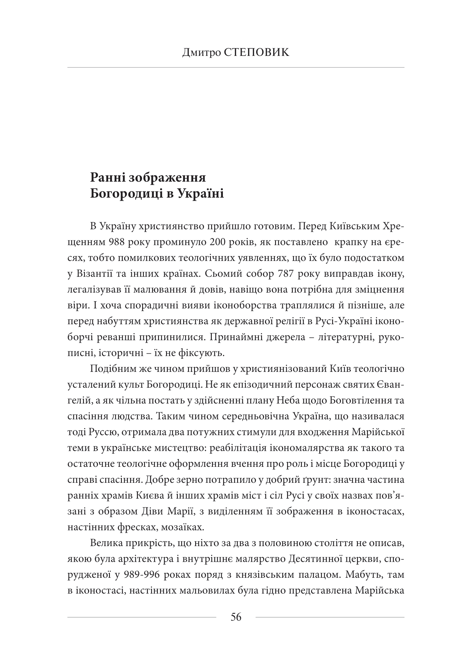 Дмитра Степовика, який є журналістом за першою освітою й тричі доктором – мистецтвознавства, філософії та богословських наук, а також членом-кореспондентом Національної академії наук. Він визнаний чільний фахівець з іконотворчості, монументального малярства, станкової та книжкової графіки. Його нова книга – глибоко особистісний, почасти полемічний, аналіз розвитку української Маріології у контексті різноманітних впливів релігійних і мистецьких течій Сходу і Заходу.