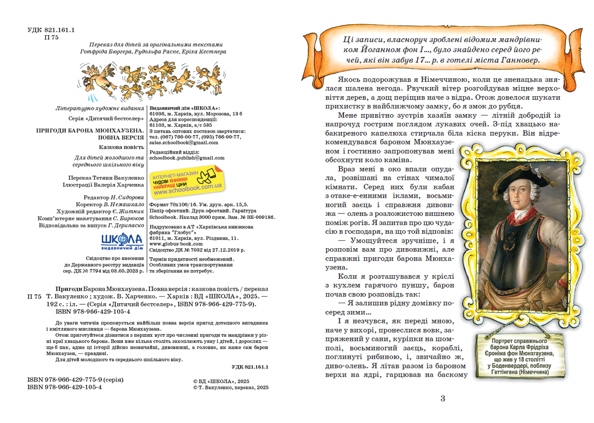 До уваги читачів пропонується найбільш повна версія пригод дотепного вигадника і кмитливого мисливця - барона Мюнхаузена. Отож приготуйтесь дізнатися з перших вуст про численні пригоди та мандрівки у різні краї хвацьливого барона. Вони вже кілька століть захоплюють і дітей, і дорослих - ще б пак, адже ці історії дійсно незвичайні, дивовижні, а головне, як каже сам барон Мюнхаузен,- правдиві. Для дітей молодшого та середнього шкільного віку.