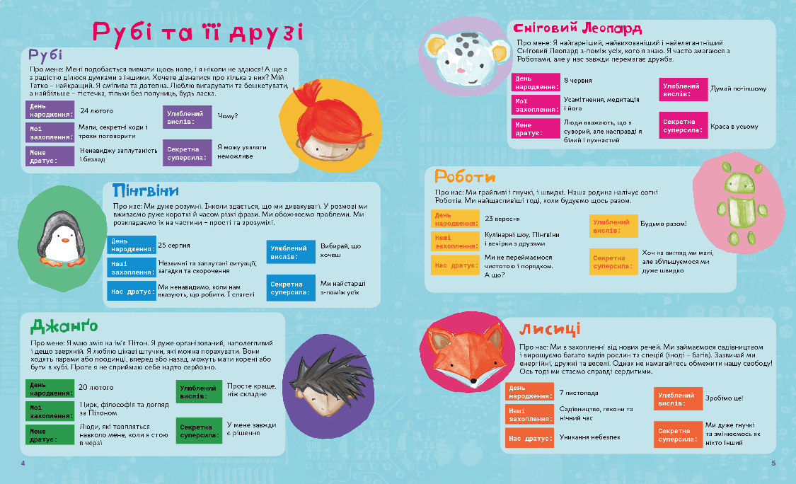 “Пригоди у Країні програмування” складається з двох частин: розповіді про пригоди дівчинки Рубі та Книги Завдань. Кожен розділ – це не просто цікава історія, а й урок розвитку продуктивного мислення. Кожен урок Книги Завдань містить “Панель інструментів” – додаткову інформацію для дорослого і перелік програмних концепцій, на яких базується урок. Пояснення всіх термінів можна знайти у Глосарії.
