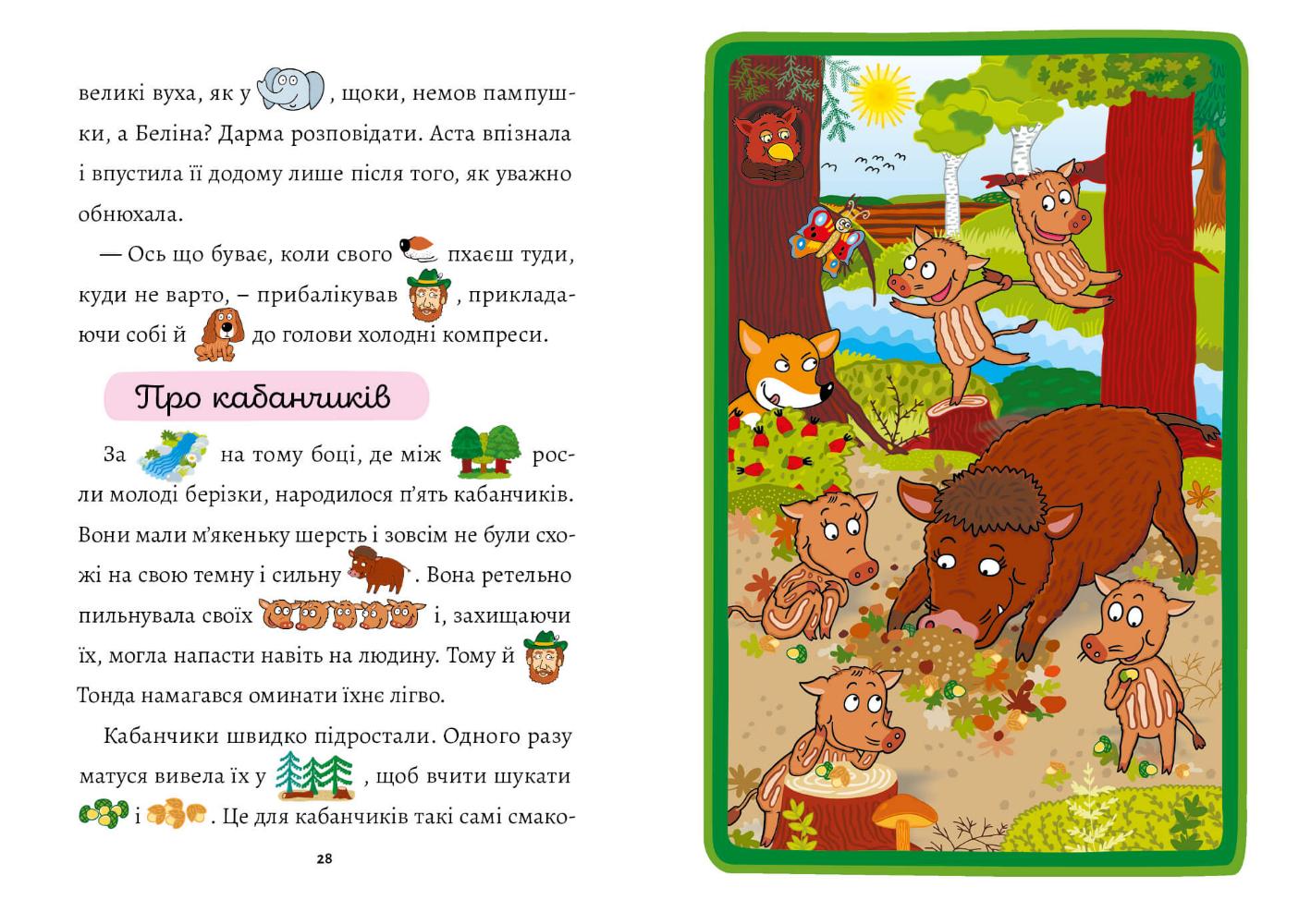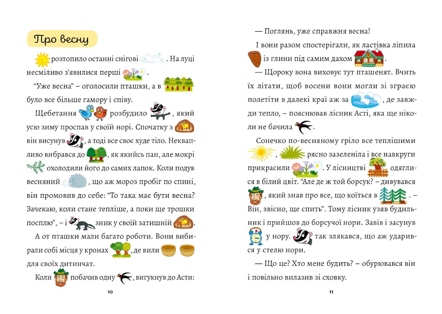 Деякі слова замінені на маленькі зображення, що полегшує читання та розвиває логічне мислення і творчу уяву. Книжка допоможе дітям: підготуватися до школи; навчитися читати; з користю проводити позаурочний час.