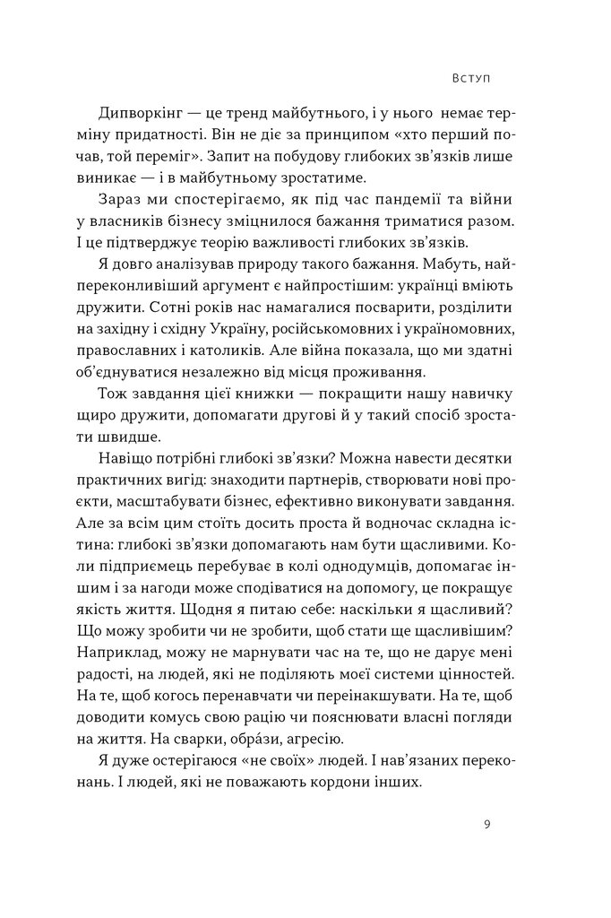 Дипворкінг (похідне від нетворкінг) — це мережа ваших глибоких зв’язків. Такі люди мають з вами набагато більше спільного, аніж тільки хобі чи рід діяльності. Ви об'єднані на вищих рівнях — місії, цінностей і переконань. Дипворкінг — це тренд майбутнього. Запит на побудову глибоких зв'язків лише виникає. У майбутньому він посилюватиметься. Тож саме зараз варто інвестувати свій час у вибудовування глибоких зв’язків. Навіщо? Можна навести багато практичних вигод: знаходити партнерів, створювати нові проєкти, масштабувати бізнес, ефективно виконувати завдання. Але за всім цим стоїть досить проста й водночас складна перевага: глибокі зв'язки допомагають нам бути щасливими. Тому пропоную вам поринути у світ дипворкінгу — вміння вибудовувати глибокі зв'язки. Це перша в світі книжка, що розкриває потенціал дипворкінгу, і, надає всі інструменти для методичного вибудовування глибоких зв’язків.
