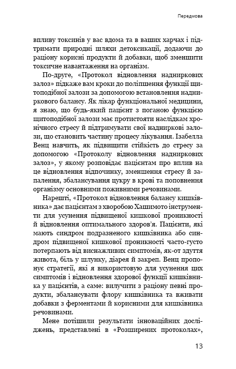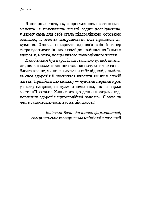 Доктор Ізабелла Венц багато років хворіє на неї, а відтак їй є чим поділитися з читачами своєї другої книги-бестселера. Вона зрозуміло й науково обґрунтовано пояснює передумови збоїв у роботі щитоподібної залози та наслідки війни, яку починає вести імунітет проти власного організму. А головне — спираючись на свій досвід і консультації з багатьма лікарями та їхніми пацієнтами, Ізабелла Венц пропонує читачам унікальну програму, яка допоможе стати на шлях зцілення й позбавитися залежності від гормональних препаратів, а також запобігти виникненню порушень у роботі щитоподібної залози.