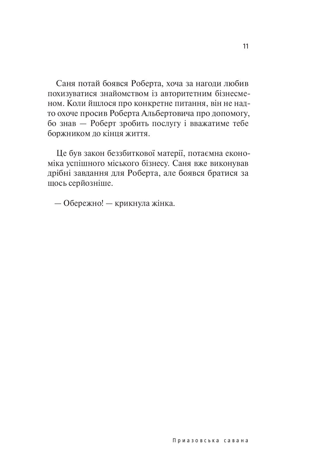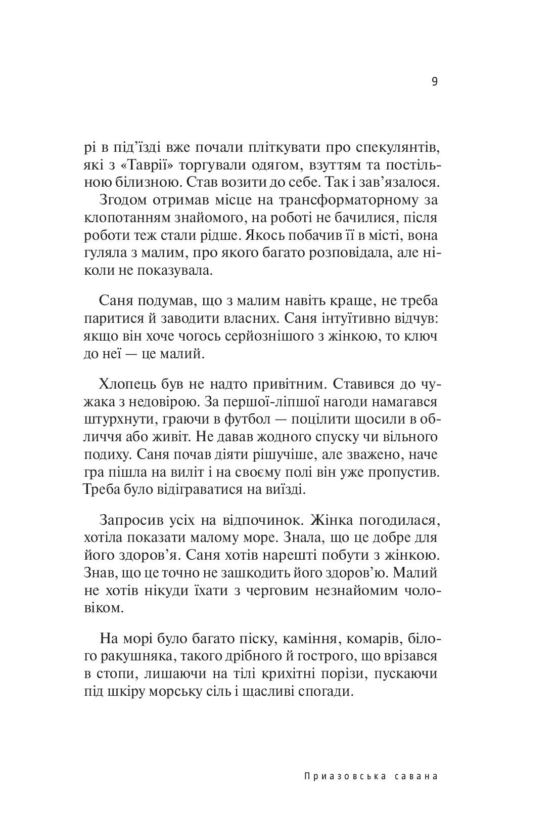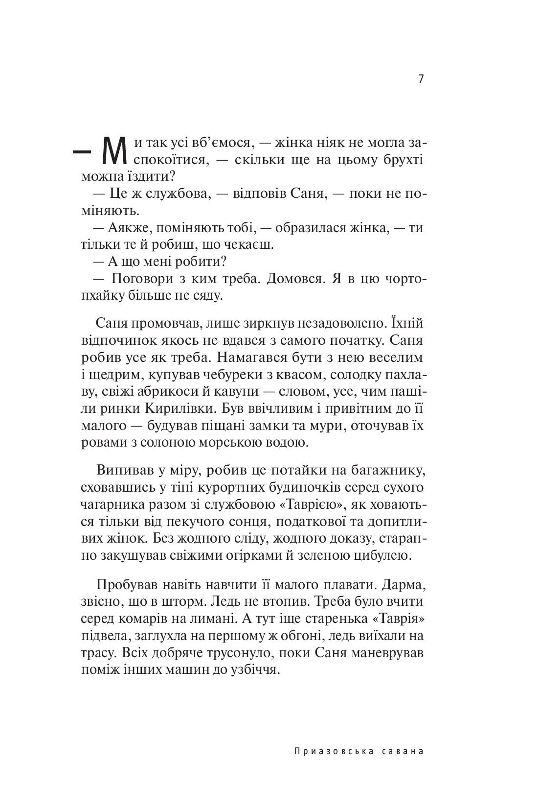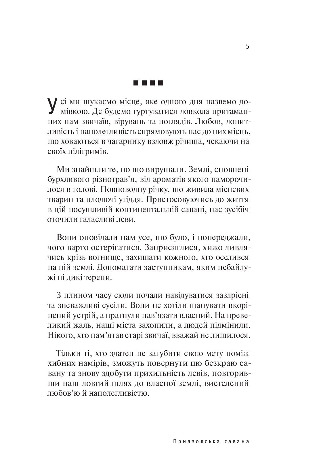 Приазовська савана — це гарячий південь України, повний яскравого сонця, солодких абрикосів та шовковиці, ароматних сухоцвітів та подорожей на Азовське море. Місце, де магічний світ природи ледь уживається з абсурдним реалізмом пострадянського оточення. Підліток Кирило, або просто Кіра, живе в Запоріжжі початку 2000-х. Одного дня Кіра вирушає на пошуки батька, якого не бачив із дитинства. У дорозі на нього чатують містичні леви, здатні захистити або розірвати на місці, стрілянина посеред нічної Хортиці та погоня з несподіваним фіналом. Подорож Приазовською саваною не вимірюється кілометрами, це шлях дорослішання у складних стосунках із сім’єю, переживання першої закоханості, пошуку своєї ідентичності та краси там, де ти народився та виріс. Такий шлях ми всі розпочинаємо, не знаючи, де він закінчиться, маючи єдину спробу наповнити своє життя справжніми почуттями.