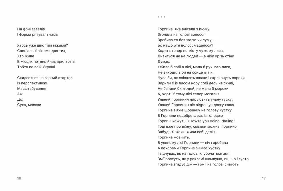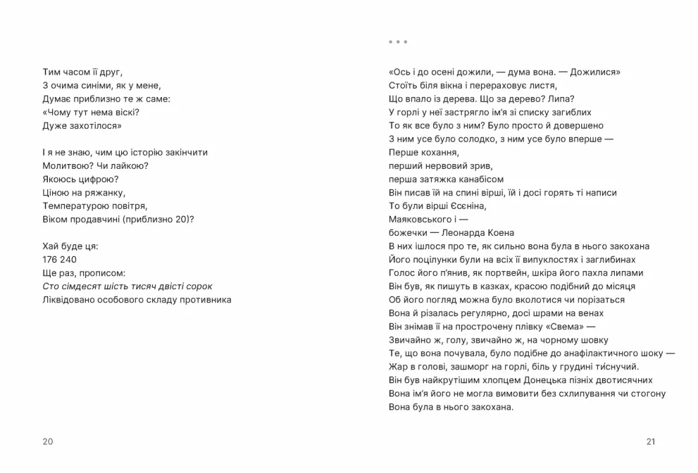 Поезія Марини Пономаренко акумулює наше проживання війни як буденної неможливості, як недійсної дійсності, як смертельно надривної жаги до (за Стусом) самособоюнаповнення в час, коли всю душу, здається, випито до дна.