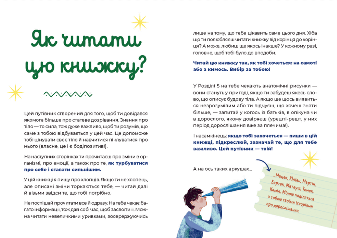 Усередині ти знайдеш справжні історії від звичайних хлопців — таких, як і ти. Тож розгортай цей путівник — і поринь у твоє бодіпозитивне дорослішання!
