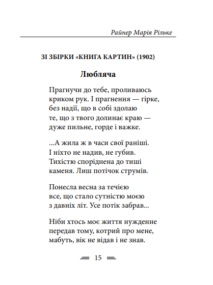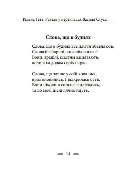 До цієї унікальної збірки ввійшли всі 94 Стусівські переклади з Рільке, 5 перекладів з Гете і надзвичайно важливий переклад вірша єврейської поетки Рахель під назвою «Метaй», або «Мої мерці». Це символічний фінал всієї книги перекладів і квінтесенція Стусової філософії: виростати з традиції, аби підтримувати творче горіння і в такий спосіб долучатися до творення світової культури.