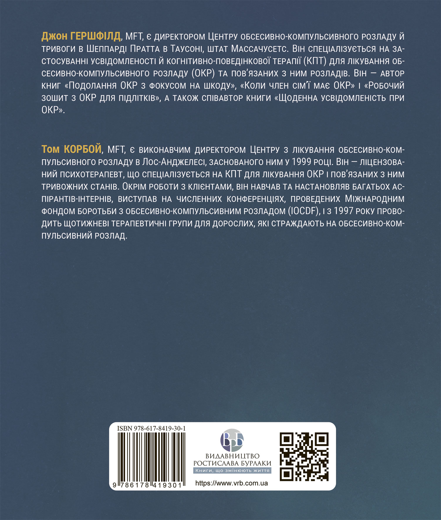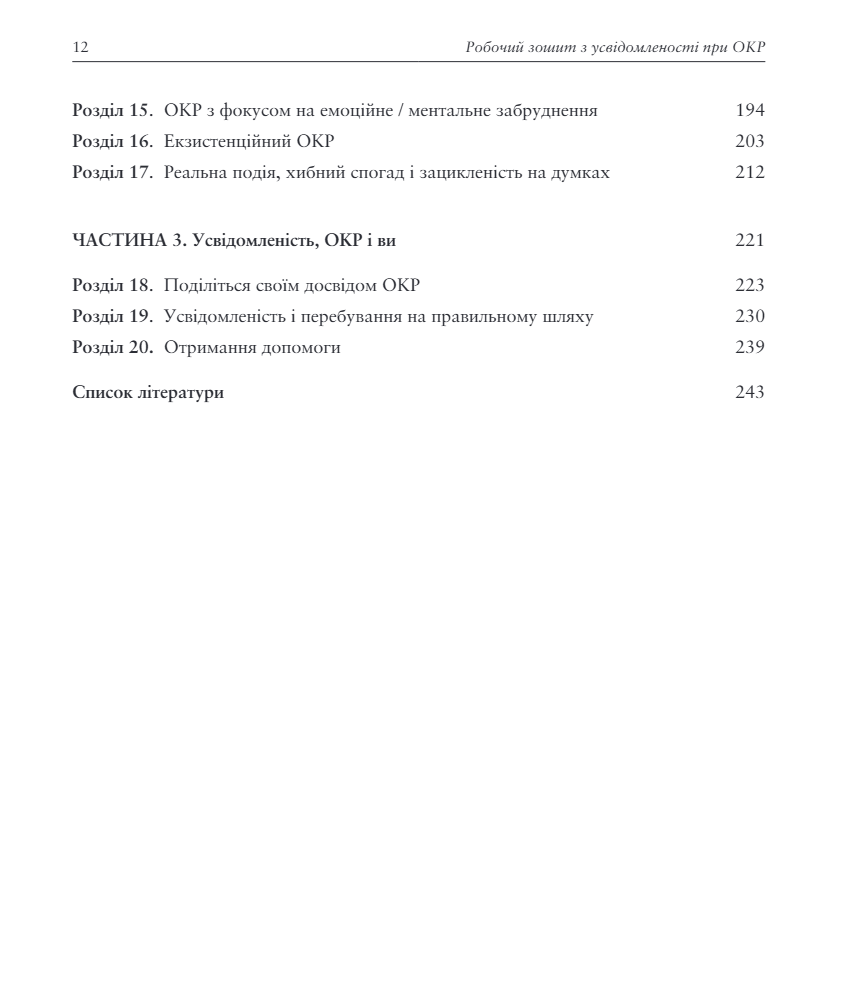 Автори, які добре розуміють, яких страждань завдає ОКР щодня, поєднали КПТ і найсучасніші техніки, що засновані на усвідомленості й уже довели свою ефективність у лікуванні обсесивно-компульсивного розладу. Книга дає змогу читачеві усвідомлено дослідити способи, якими ОКР сформував свою владу, і пропонує конкретні вправи для послаблення цієї влади й відновлення життя та ідентичності, вільних від ОКР.