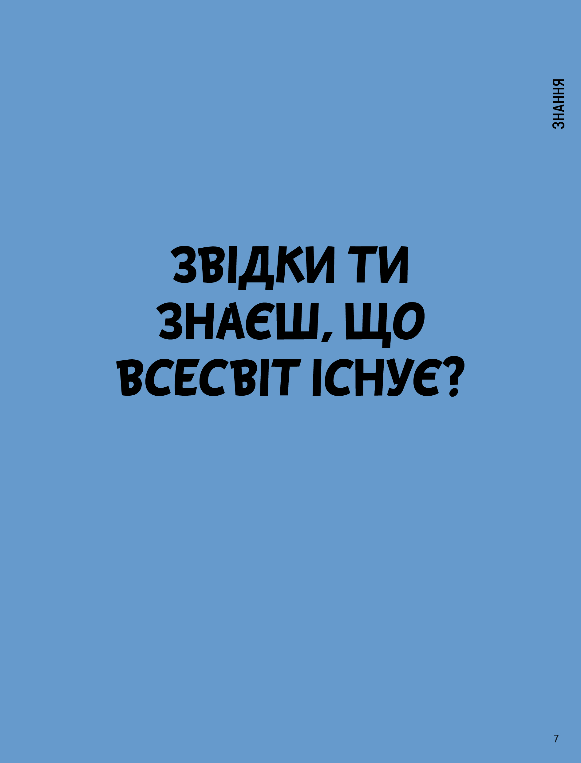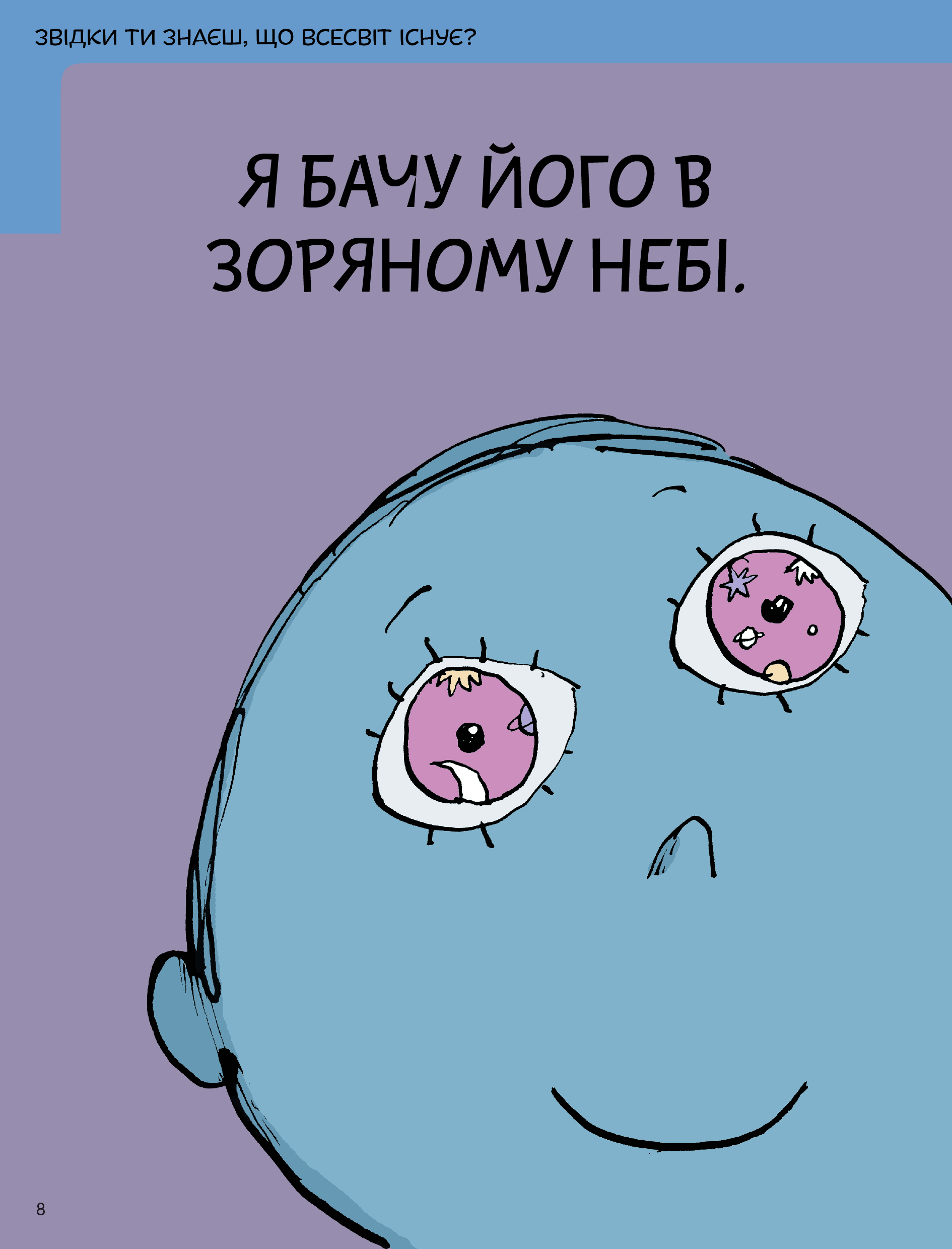 Що таке Всесвіт? Чи справді нам потрібно знати все? Чи належать нам наші ідеї? І для чого взагалі потрібна уява? Оскар Бреніф’є запрошує юних читачів до захоплюючої філософської подорожі, ставлячи прості, але важливі питання про навчання, пізнання світу та самих себе.