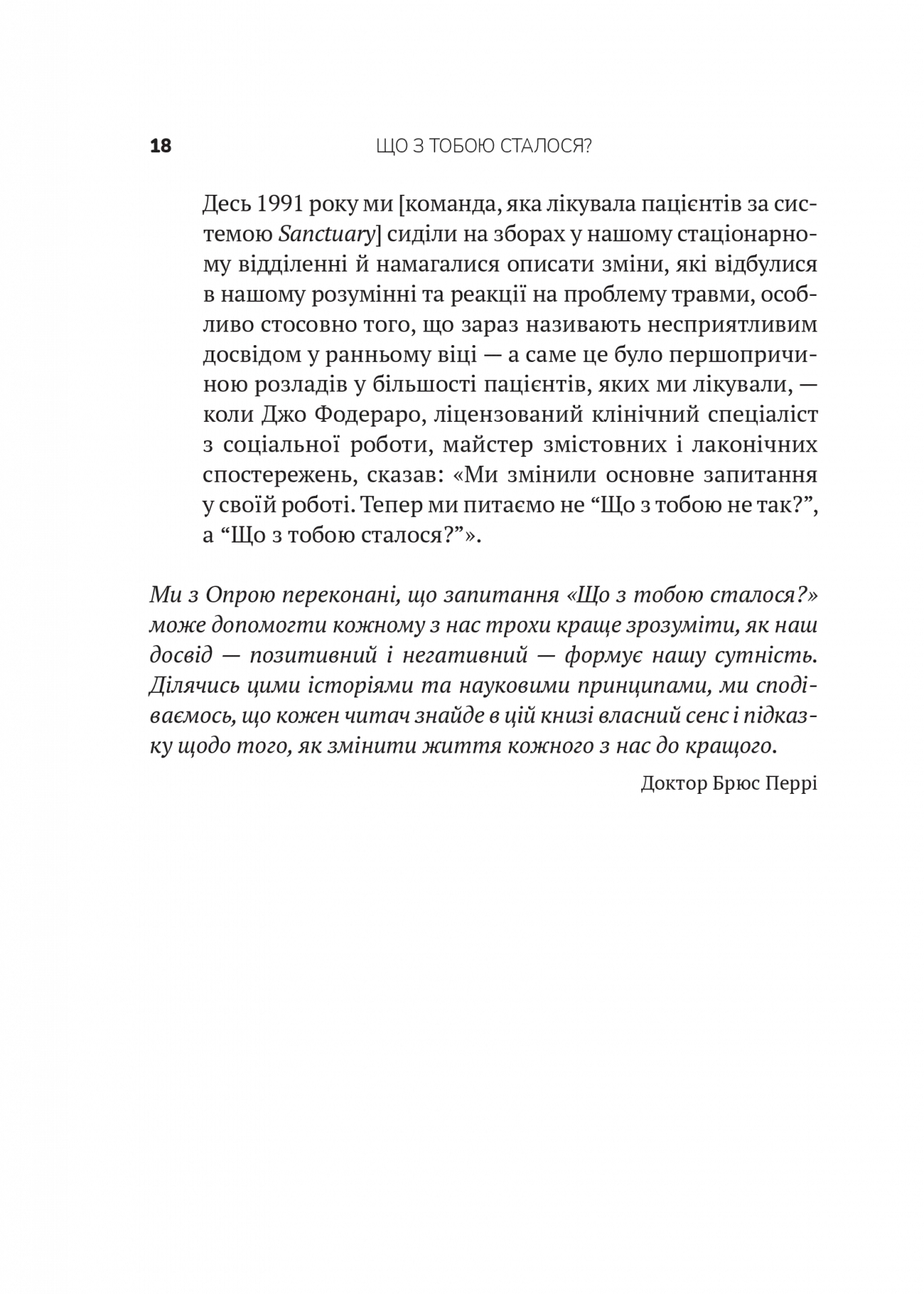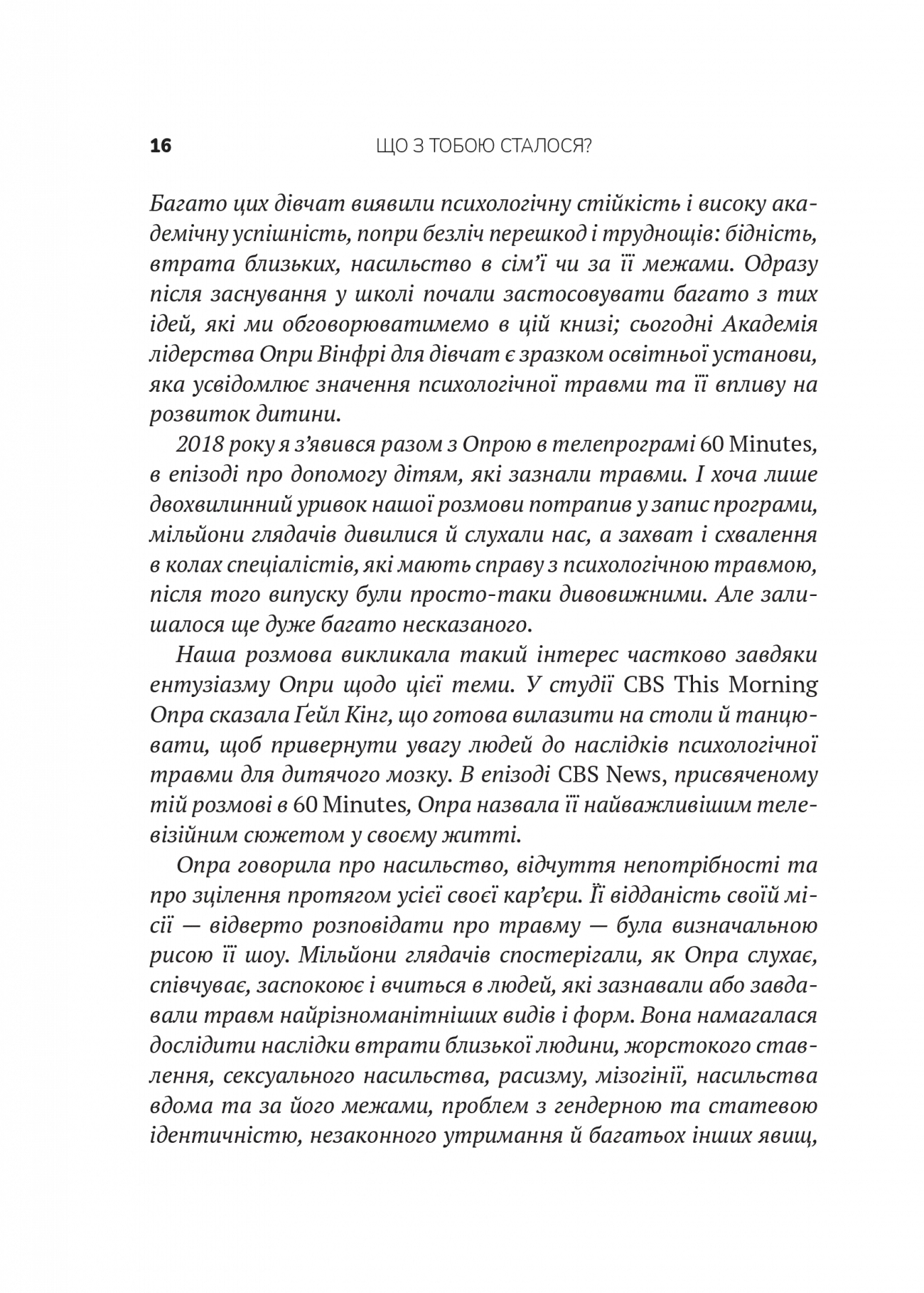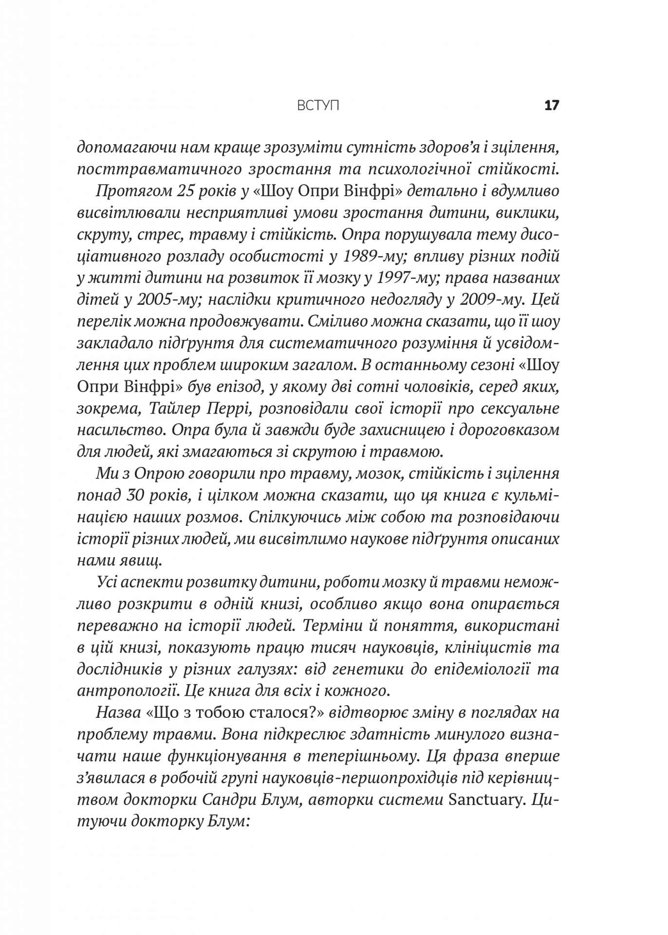 Книга «Що з тобою сталося? Про травму, психологічну стійкість і зцілення» — це корисний нонфікшн Опри Вінфрі й Брюса Перрі про психологічні травми, пошук себе й усвідомлення свого непростого досвіду. Погані вчинки й слова часто змушують шукати недоліків у собі, а фізичний удар від людини або ж ляпас грубим словом назавжди лишаються раною, яка повсякчас стікає кров’ю на серці. Плоди травми вкорінюються настільки, що визначає всі наші стосунки, рішення й поведінку в житті.