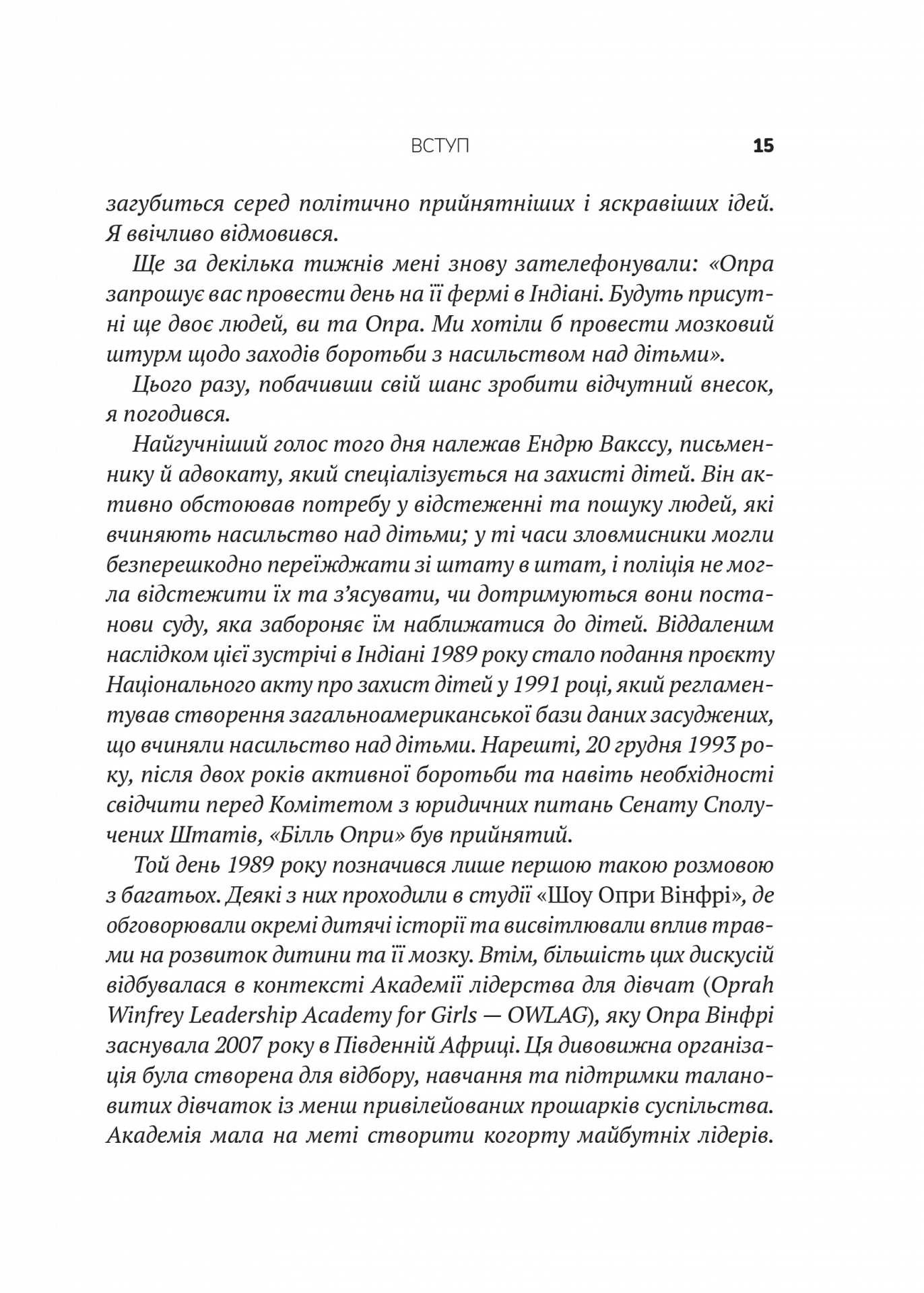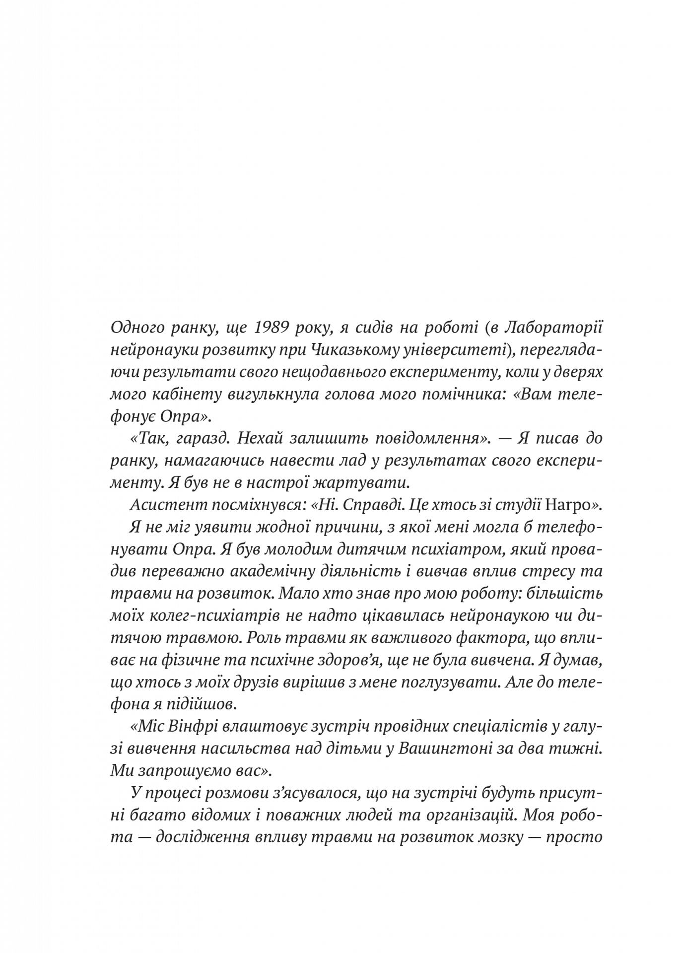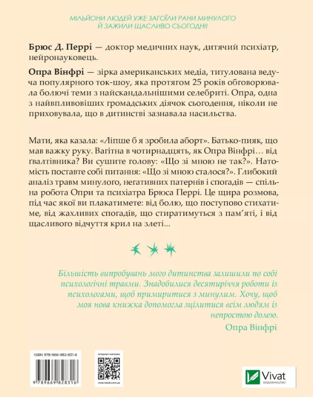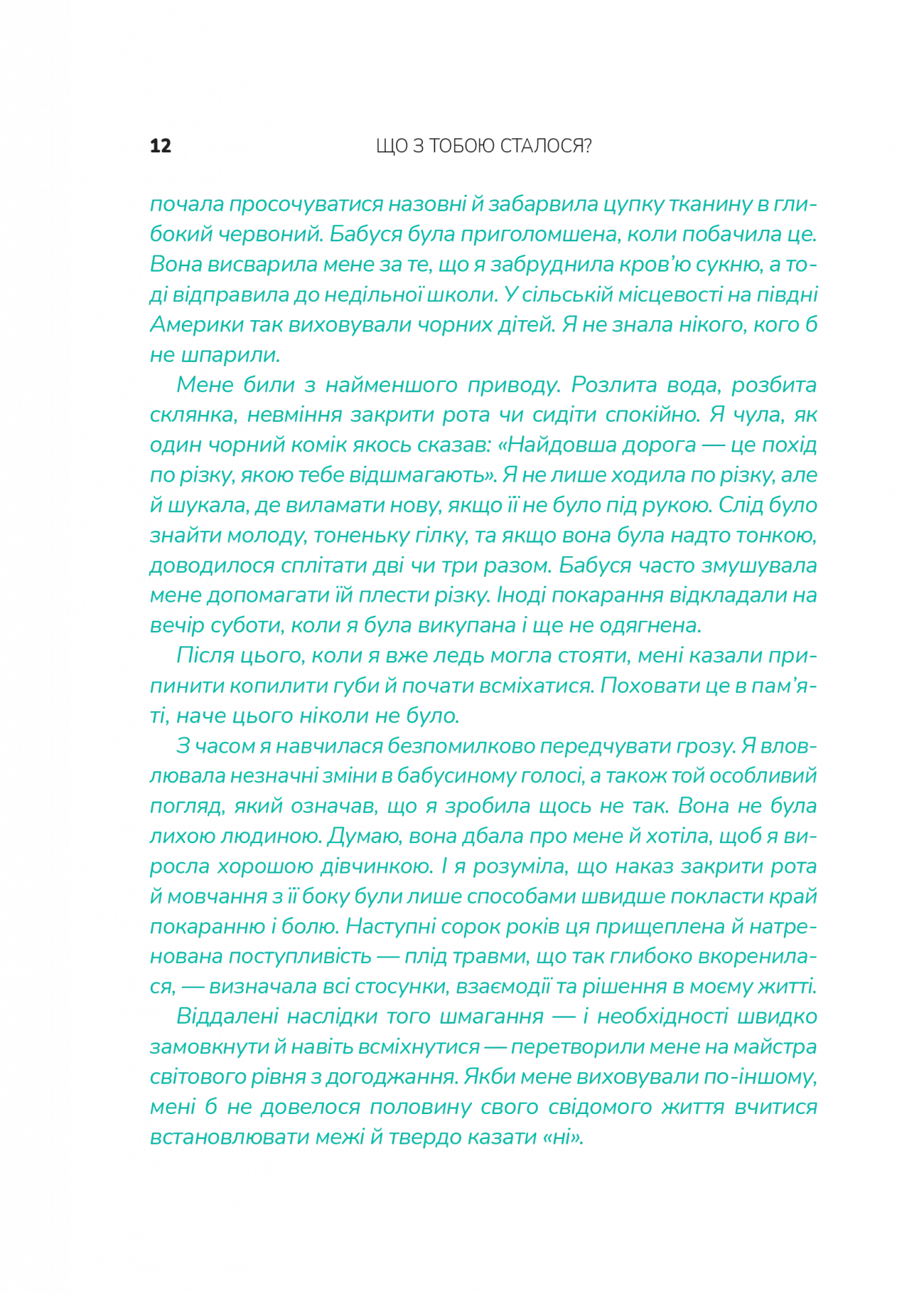 Книга «Що з тобою сталося? Про травму, психологічну стійкість і зцілення» — це корисний нонфікшн Опри Вінфрі й Брюса Перрі про психологічні травми, пошук себе й усвідомлення свого непростого досвіду. Погані вчинки й слова часто змушують шукати недоліків у собі, а фізичний удар від людини або ж ляпас грубим словом назавжди лишаються раною, яка повсякчас стікає кров’ю на серці. Плоди травми вкорінюються настільки, що визначає всі наші стосунки, рішення й поведінку в житті.