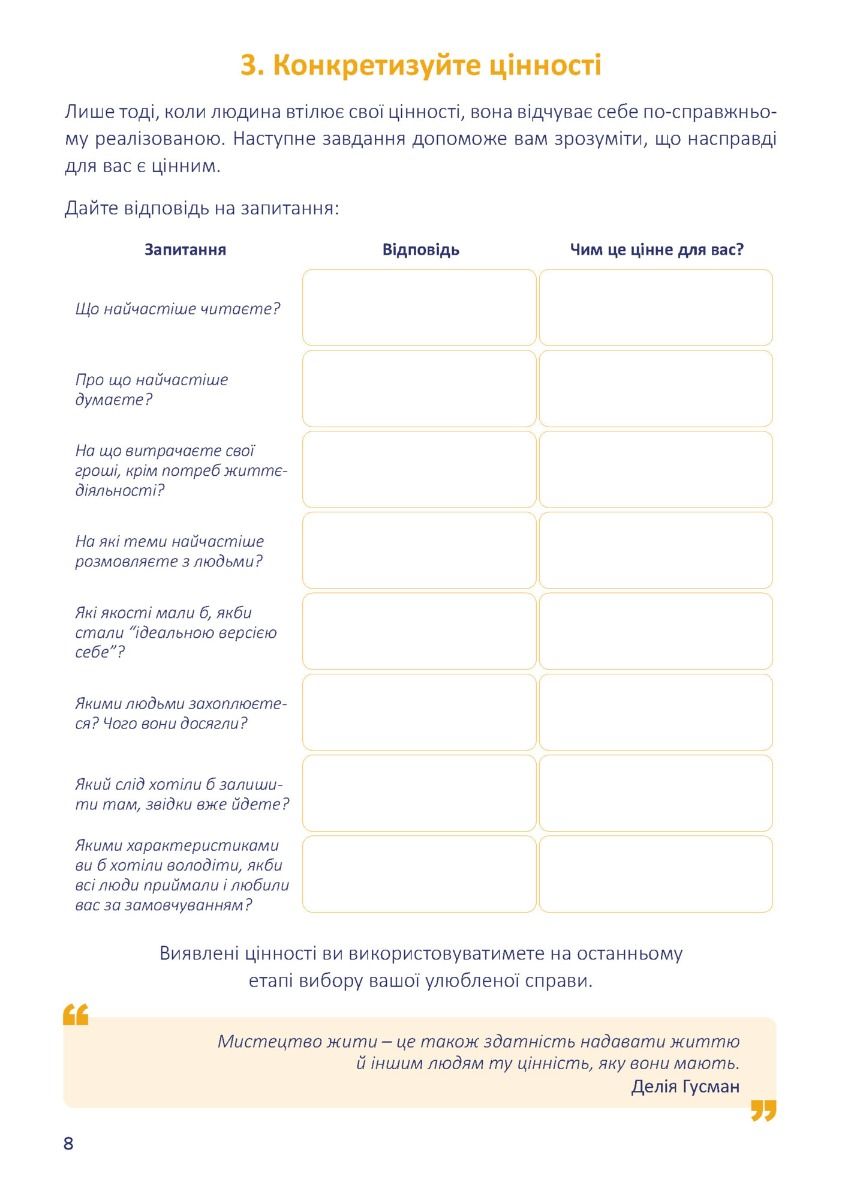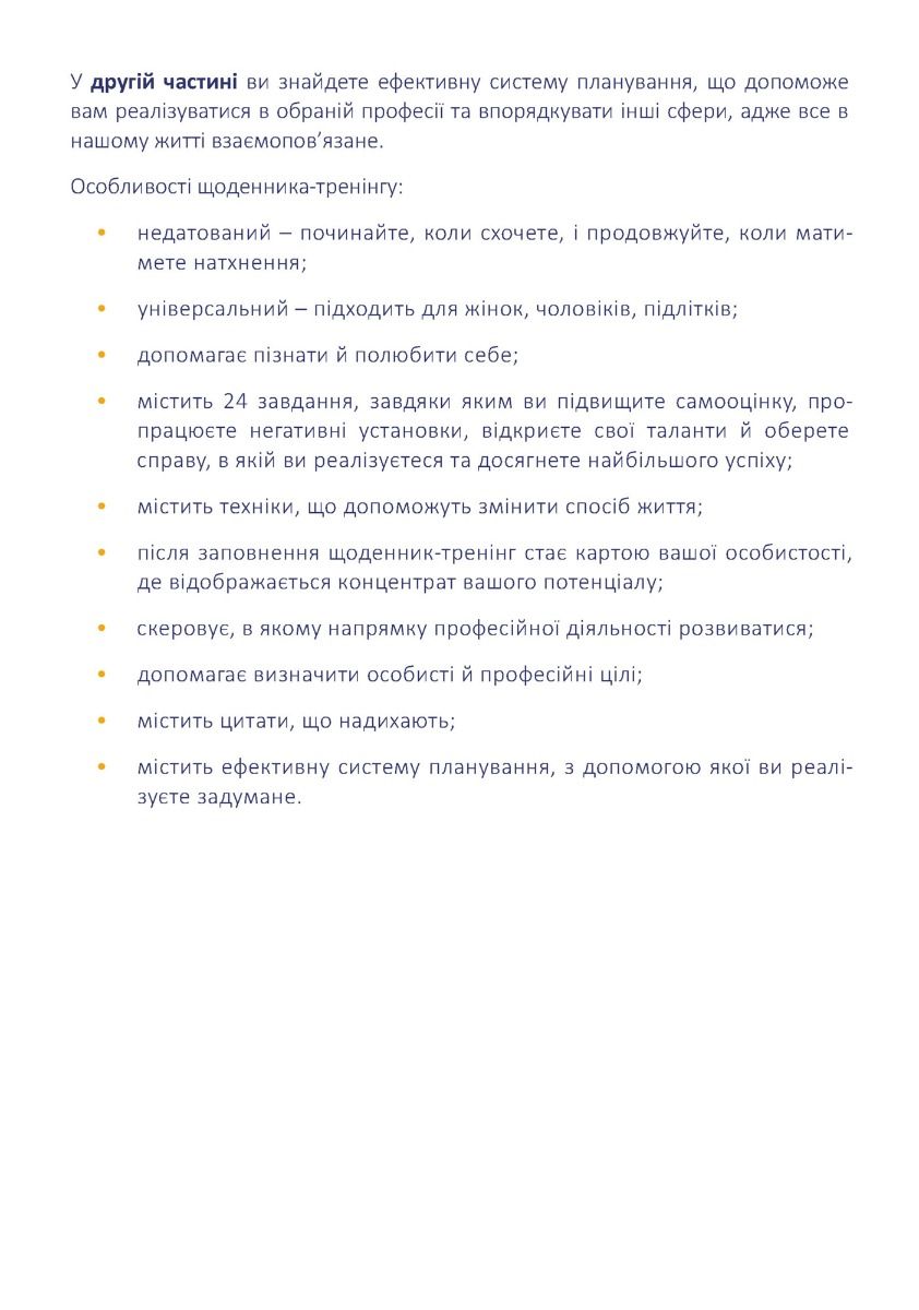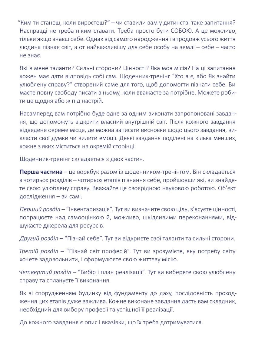Які в мене таланти? Сильні сторони? Цінності? Яка моя місія? На ці запитання кожен має дати відповідь собі сам. Щоденник-тренінг "Хто я є, або Як знайти улюблену справу?” створений саме для того, щоб допомогти пізнати себе. Ви маєте повну свободу писати в ньому, коли вважаєте за потрібне. Можете робити це щодня або ж під настрій.