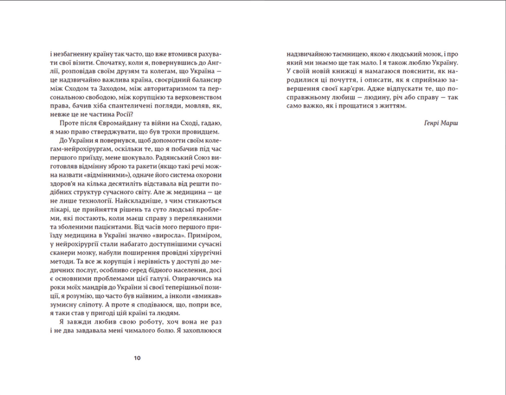 Генрі Марш — чудовий співрозмовник: випадки з хірургічної практики у Британії, Непалі, Україні перемежовуються яскравими та щемкими епізодами з його дитинства та юності, непересічними моментами професійного становлення та простими й водночас приголомшливо глибокими роздумами про те, що справді має значення.