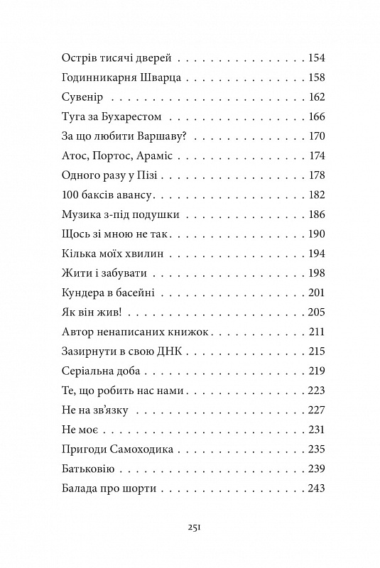 Це книжка пригод і настроїв, реальних історій і автобіографічних вигадок, універсальний порадник і атлас туристичних маршрутів. У цих текстах свідки Єгови п’ють коньяк, Мілан Кундера опиняється в басейні, а водії «мерседесів-спринтерів» женуться за каретами швидкої допомоги. Словом, абсурдно, зате пізнавально, часом меланхолійно, але частіше кумедно.