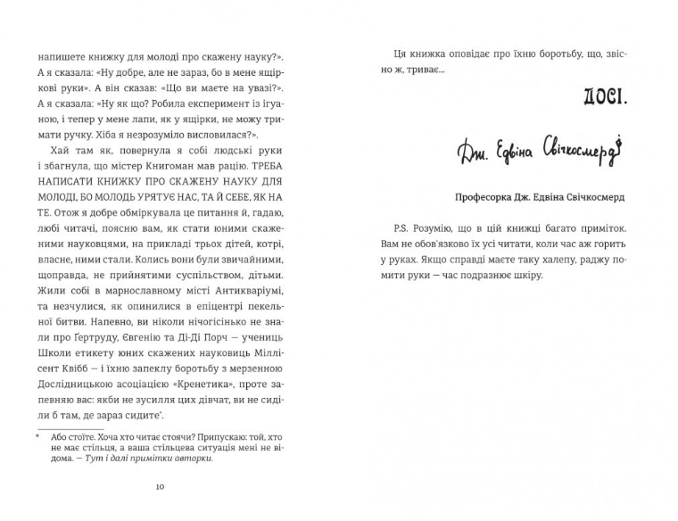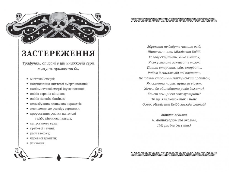 Ніхто на цілім світі, не те що в місті Антикваріум, не мріяв опинитися в руках у Міллісент Квібб — загрозливої, страхітливої, легендарної скаженої науковиці! Та й хто проміняв би захопливі уроки етикету на дивакуваті досліди й польоти на мухоциклі? Хіба що сестрички Порч — Ґертруда, Євгенія та Ді-Ді, яким судилося не просто пізнати скажену науку, а й порятувати рідне місто від зловісних змовників.