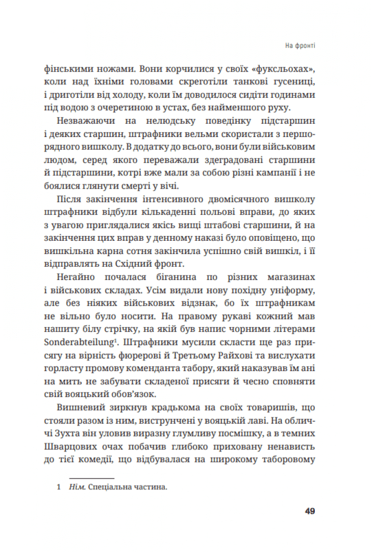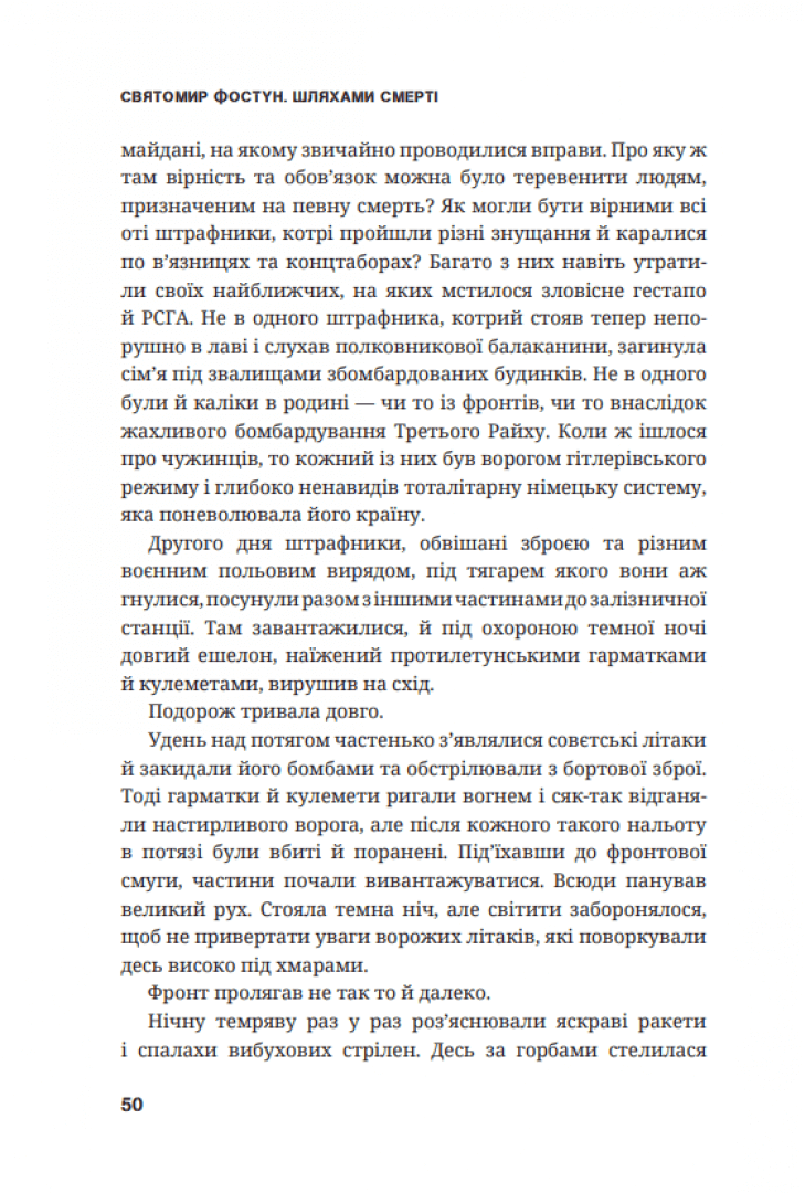 Найцікавіші книги завжди пишуться за мотивами власного життєвого досвіду. Саме до таких належить «Шляхами смерті» бійця Української повстанської армії, в’язня німецьких концтаборів та вояка дивізії «Галичина» Святомира Фостуна Головний герой книги Олег Вишневий є бійцем УПА, у бою на Волині потрапляє до німецького полону, потім концтабір і знову окопи Другої світової, але тепер у складі штрафного батальйону. Можна ще розказати про насиченість та динамічність тексту, але навіщо переповідати враження від книги, якщо Ви, шановний читачу, можете отримати їх самостійно?