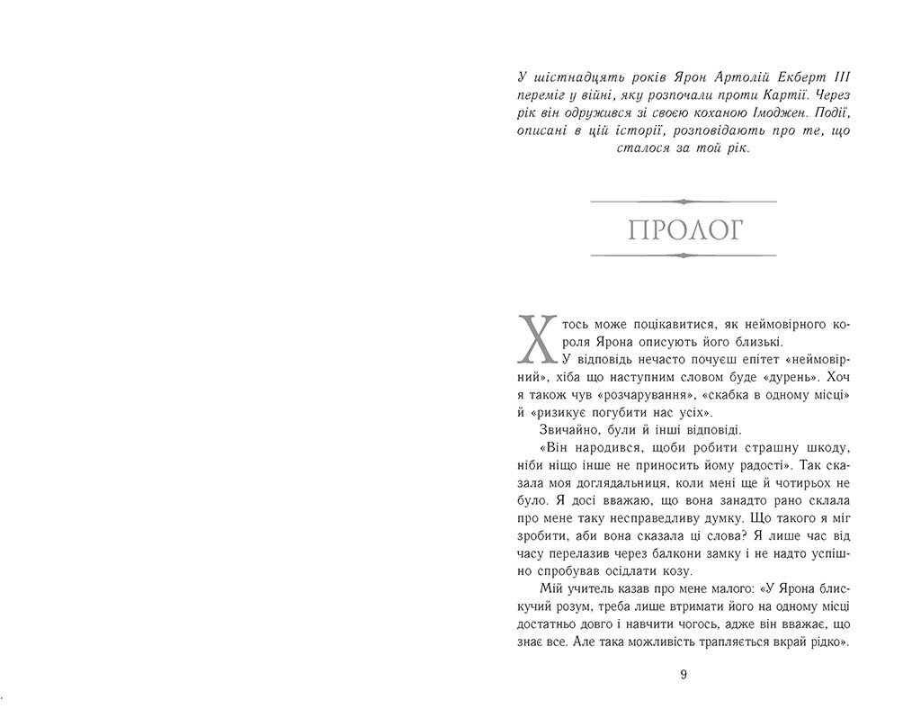 Після перемоги в Картії нарешті запанував мир… аж на кілька місяців, поки Ярон укотре не вскочив у халепу. Під час морської подорожі корабель Ярона перехоплює вороже судно, а його капітанка Джейн Стрик бере юного короля в заручники. У спробі знайти вихід із полону Ярон натрапляє на дещо цікаве в капітанській каюті: підзорну трубу із загадковим гравіюванням, яку Стрик чомусь дуже пильнує, а ще — меч і корону, які належали Дарію, його старшому брату.З думкою про те, що Дарій може бути живий, Ярон тікає з корабля та разом із друзями вирушає на далекий острів Белланд, про який згадувала Стрик, аби розкрити правду… і обман, що здатен перекреслити все, чим Ярон так дорожить.