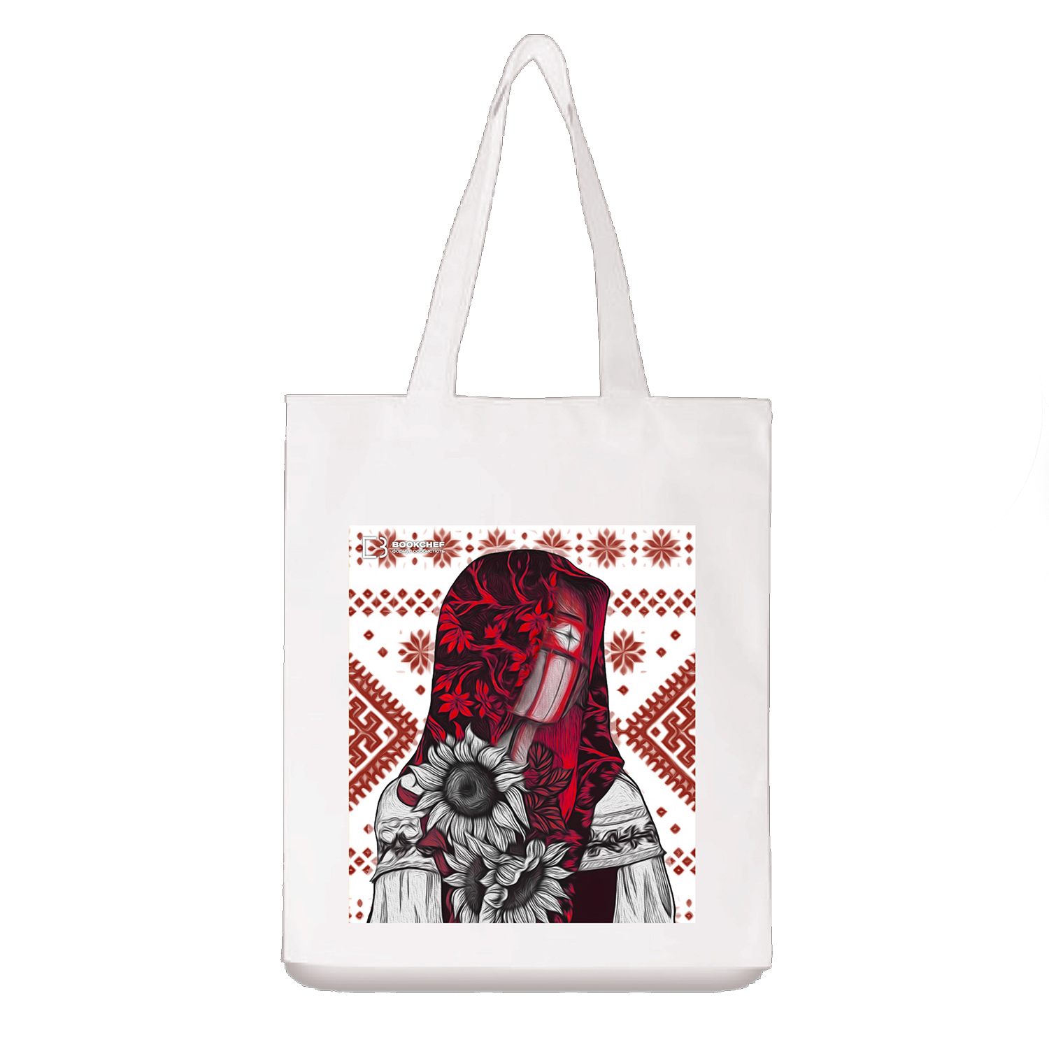 Місткий шопер бежевого кольору «Українська мотанка» має неймовірний дизайн з містично-сакральними нотками. Погляди притягує зображення ляльки-мотанки, у якої замість обличчя хрест. Така архаїчна іграшка є нашим традиційним оберегом і щасливим талісманом. Мотанка зображена на фоні геометричного червоного узору. Жіноча фігурка з соняшниками й червоними квітами замість волосся моторошна й загадкова одночасно. Для виготовлення шопера використали міцний канвас зі щільністю 220 г/кв. м. В його склад входить бавовна і трохи синтетики для міцності. Бежевий колір стилізує тканину, робить її схожою на домоткане небілене полотно. Розміри шопера – 35 х 41 см, довжина ручок – 60 см.
