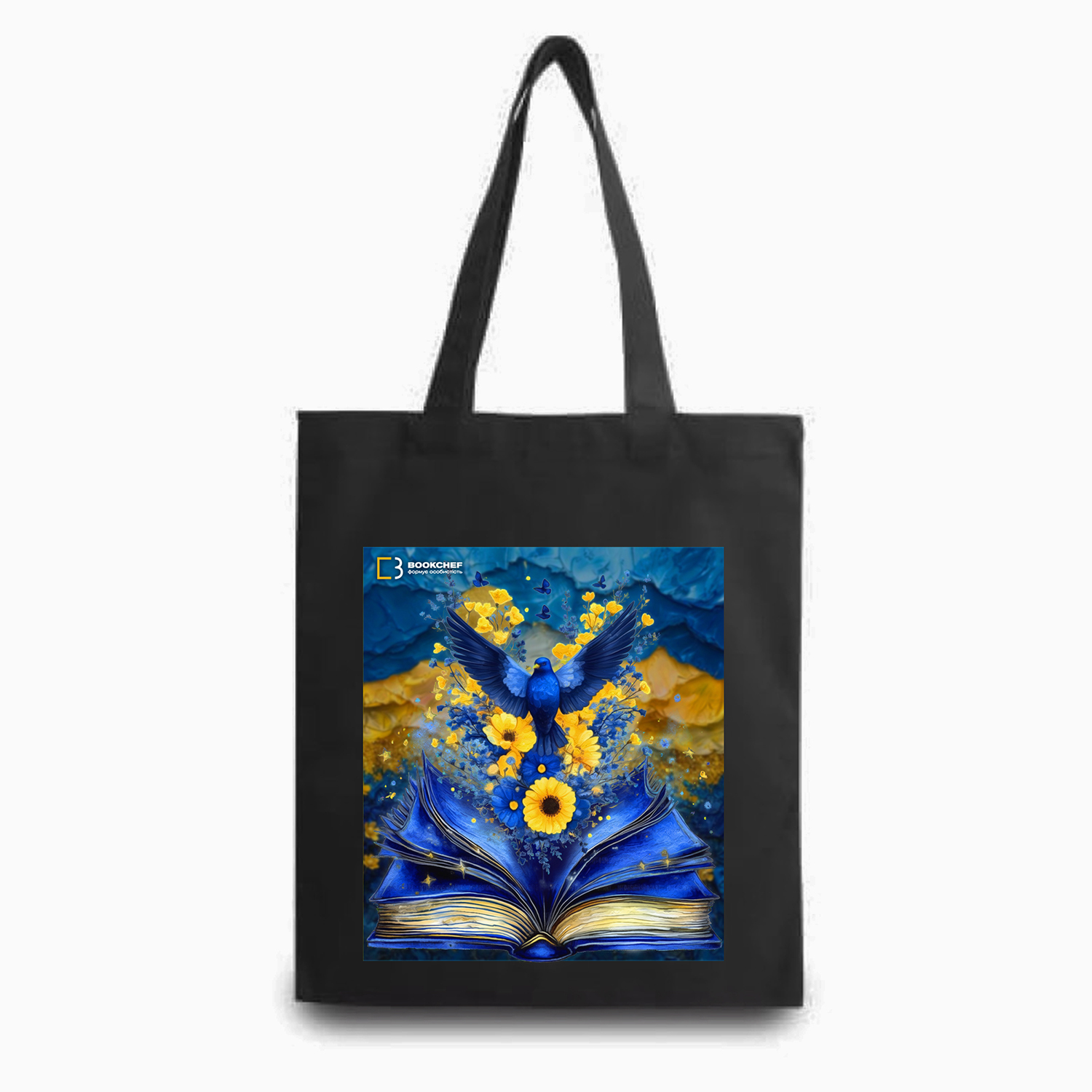 "Місткий шопер чорного кольору «Український всесвіт» відрізняється міцністю й неймовірним дизайном. Передню частину прикрашає малюнок, виконаний в кольорах і відтінках українського прапора. В центрі квітково-небесної композиції – велетенський синій птах, що символізує щасливе майбутнє України. Внизу – розгорнута книга, яка підкреслює важливість знань у цьому світі. Недаремно в духовному гімні українці просять просвітити їх «світлом науки і знання». Які б не були тяжкі часи, справжні нації поважають друковане слово.