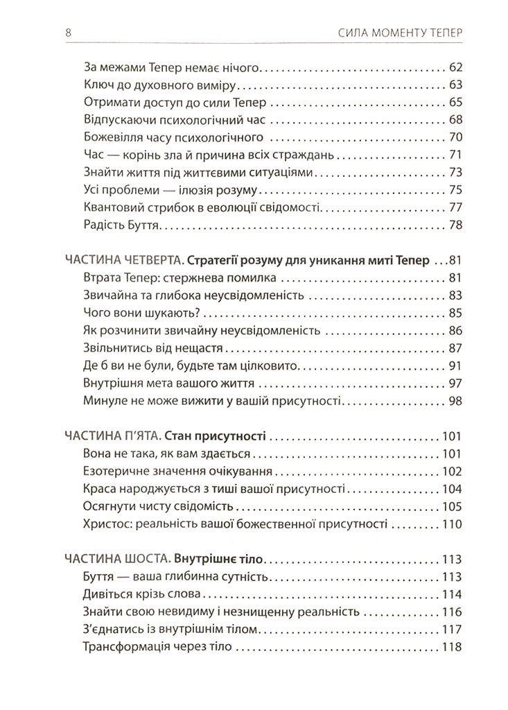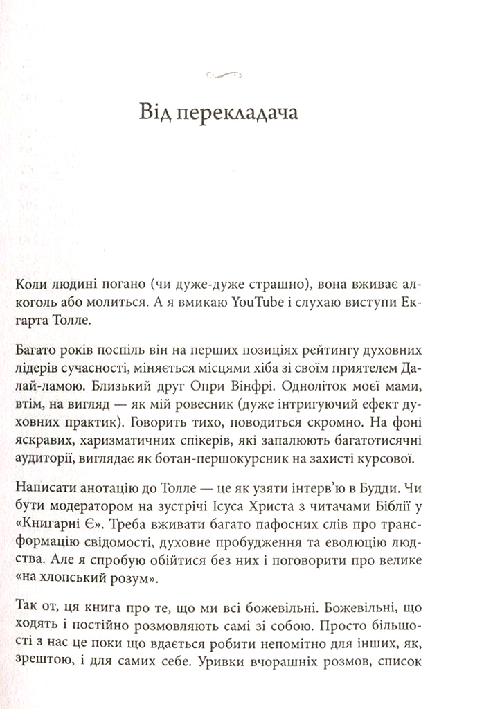 Ця книга про те, що всі ми-божевільні. Божевільні, які ходять і розмовляють самі із собою. Просто більшості з нас це поки що вдається робити непомітно для інших-як,зрештою, і для себе самих. Ця книга про важливість уміння не думати. Бо тільки там,за межею слів, є все те,чого ми так розпачливо прагнемо: натхнення, радість, справжня любов. І воно доступне нам вже і негайно- у магічній миті Тепер. Для широкого кола читачів