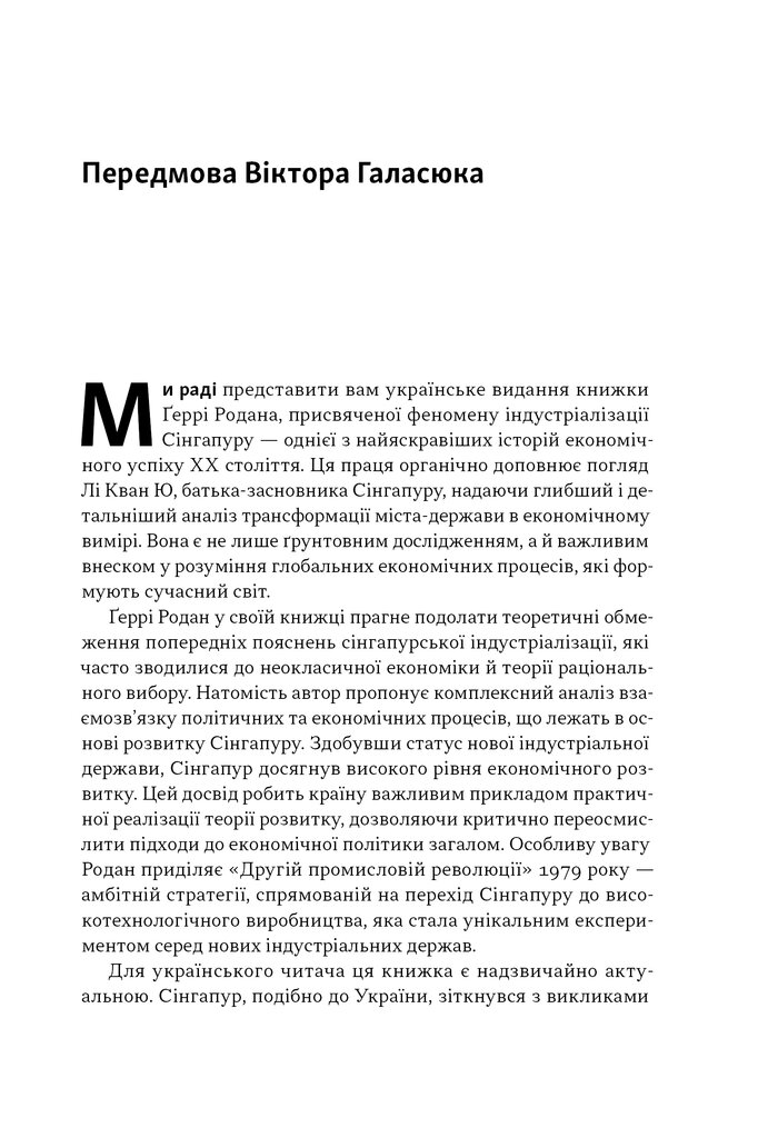Ця книжка — глибоке дослідження економічної трансформації Сінгапуру. Вона аналізує, як країна здійснила прорив, зосереджуючи увагу на промисловій політиці, державному втручанні та ролі державних інститутів. Автор розглядає ключові моменти індустріалізації Сінгапуру, зокрема стратегії, спрямовані на залучення іноземних інвестицій, створення належної інфраструктури та конкурентоспроможних виробничих секторів, розвиток освіти та меритократії.
