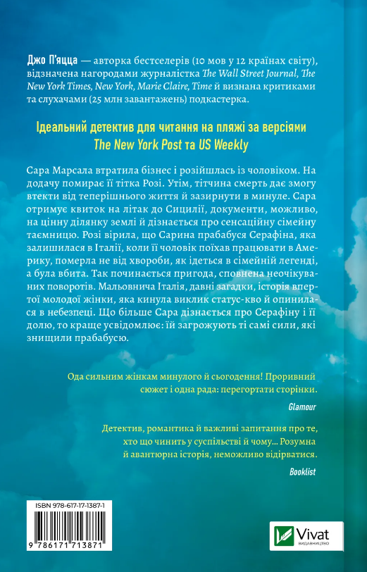 Сара Марсала втратила бізнес і розійшлась із чоловіком. На додачу помирає її тітка Розі. Утім, тітчина смерть дає змогу втекти від теперішнього життя й зазирнути в минуле. Сара отримує квиток на літак до Сицилії, документи, можливо, на цінну ділянку землі й дізнається про сенсаційну сімейну таємницю. Розі вірила, що Сарина прабабуся Серафіна, яка залишилася в Італії, коли її чоловік поїхав працювати в Америку, померла не від хвороби, як ідеться в сімейній легенді, а була вбита. Так починається пригода, сповнена неочікуваних поворотів. Мальовнича Італія, давні загадки, історія впертої молодої жінки, яка кинула виклик статус-кво й опинилася в небезпеці. Що більше Сара дізнається про Серафіну і її долю, то краще усвідомлює: їй загрожують ті самі сили, які знищили прабабусю.