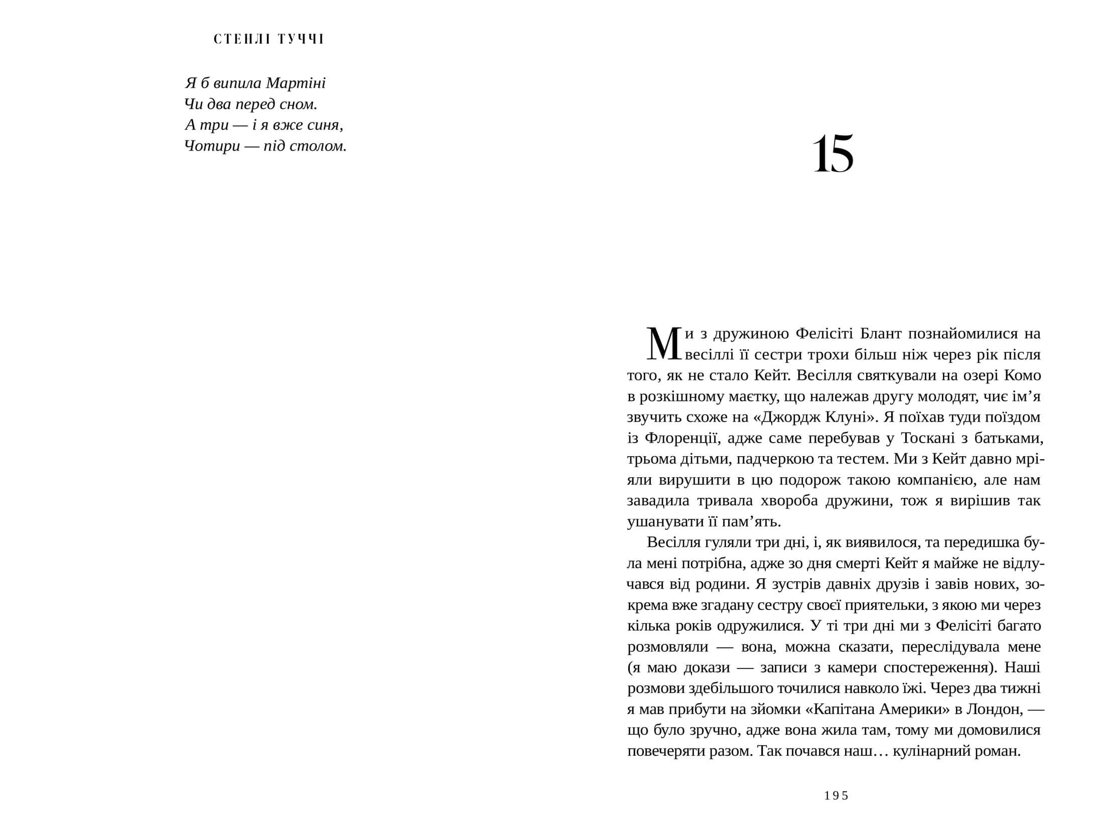 Перш ніж стати «тим самим актором» із «Диявол носить “Прада”», «Милих кісток» чи «Голодних ігор», а також творцем ідеального негроні, Стенлі Туччі ріс в італо-американській родині, яка кожен вечір проводила за столом. Ця книжка — його роздуми про взаємозв’язок життя та їжі, гастрономічна подорож у минуле, як щасливе, так і болісне, написана з любов’ю й щедро приправлена фірмовим гумором.