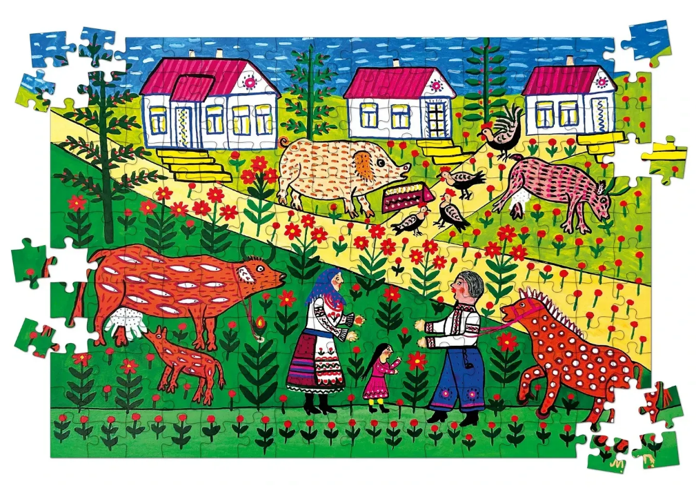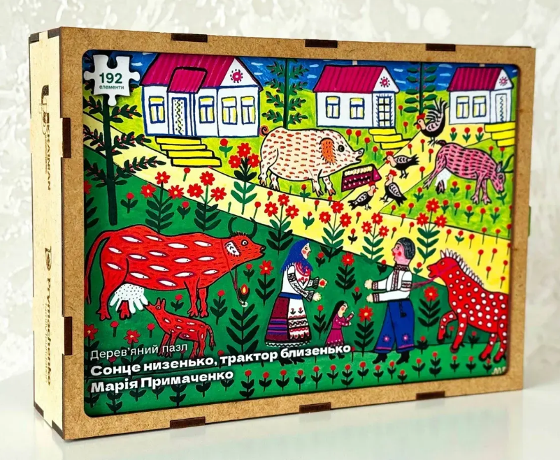 Дерев’яний пазл «Сонце низенько, трактор близенько» створено за мотивами картини Марії Примаченко - однієї з найвідоміших українських художниць. Її роботи відзначаються яскравими кольорами, казковими істотами та символами, які зрозумілі як дітям, так і дорослим. Збираючи цей пазл, Ви торкаєтесь унікального художнього світу, де поєднано народні мотиви, фантастичне мислення й неповторний стиль, що вирізняє творчість Марії Примаченко серед інших.