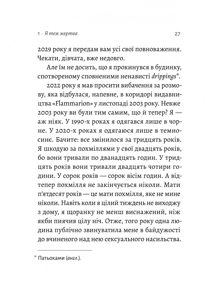 Автопортрет скандального письменника, ловеласа й інтригана Фредеріка Беґбедера – це свідчення людини, яка перебуває між двох поколінь і кається в тому, що йому не вдалося бути людиною déconstruit. Він намагається визнати (не без доброї дози гумору і провокацій) свої колишні помилки і вольності передовсім усвідомлюючи у дзеркалі власне відображення.
