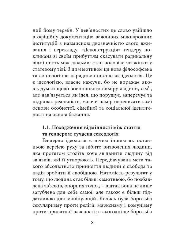 Автори аналізують спроби гендерних ідеологів відокремити стать від людської ідентичності й звести її до соціального конструкту, наголошуючи на ризиках такого підходу для цілісності особистості. Вони спираються на герменевтику есенціалізму та метафізичного реалізму, у якій стать розглядається як фундаментальна й багатовимірна характеристика людини, що охоплює тілесний, психічний і культурний аспекти. Автори акцентують увагу на небезпеці редукціонізму та ідеологічних спроб переписати природу людини, а також пропонують осмислений підхід до питань ідентичності, свободи й справжнього покликання особистості.