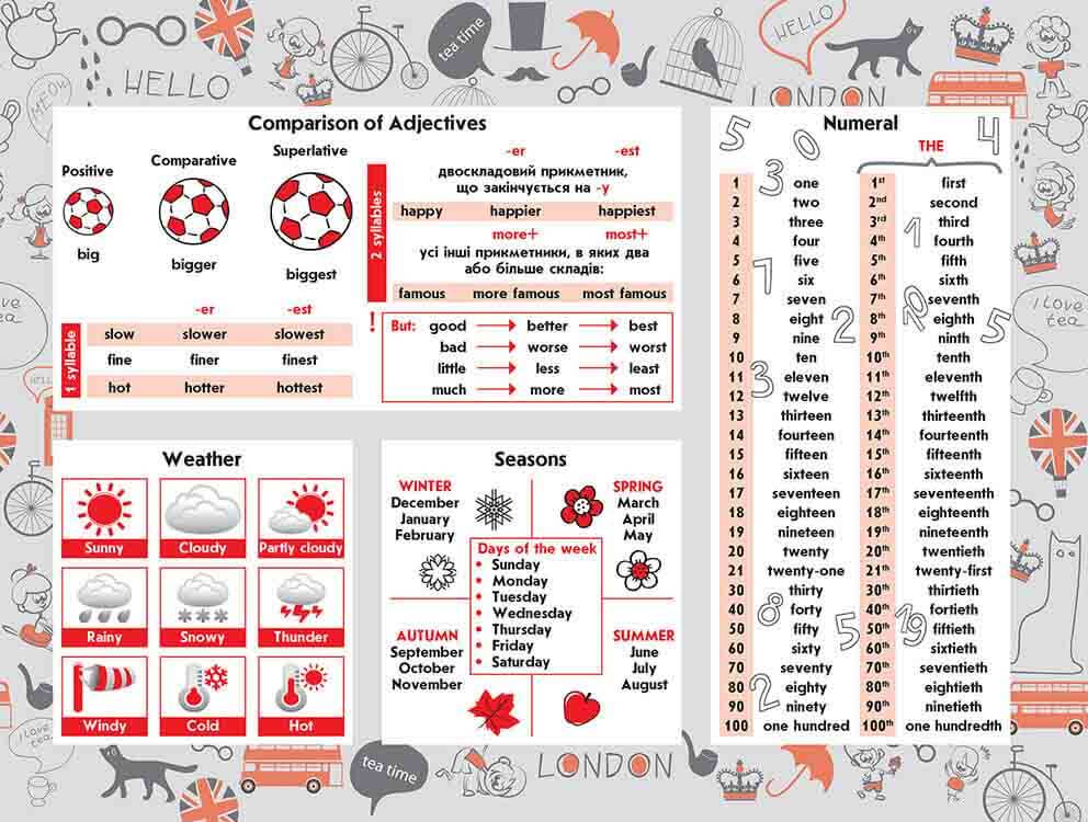 Крім основних тем із граматики англійської мови, що вивчаються у 1–4 класах, стікербук містить також важливу для запам’ятовування лексику: цифри, час, дні тижня, сезони тощо.
