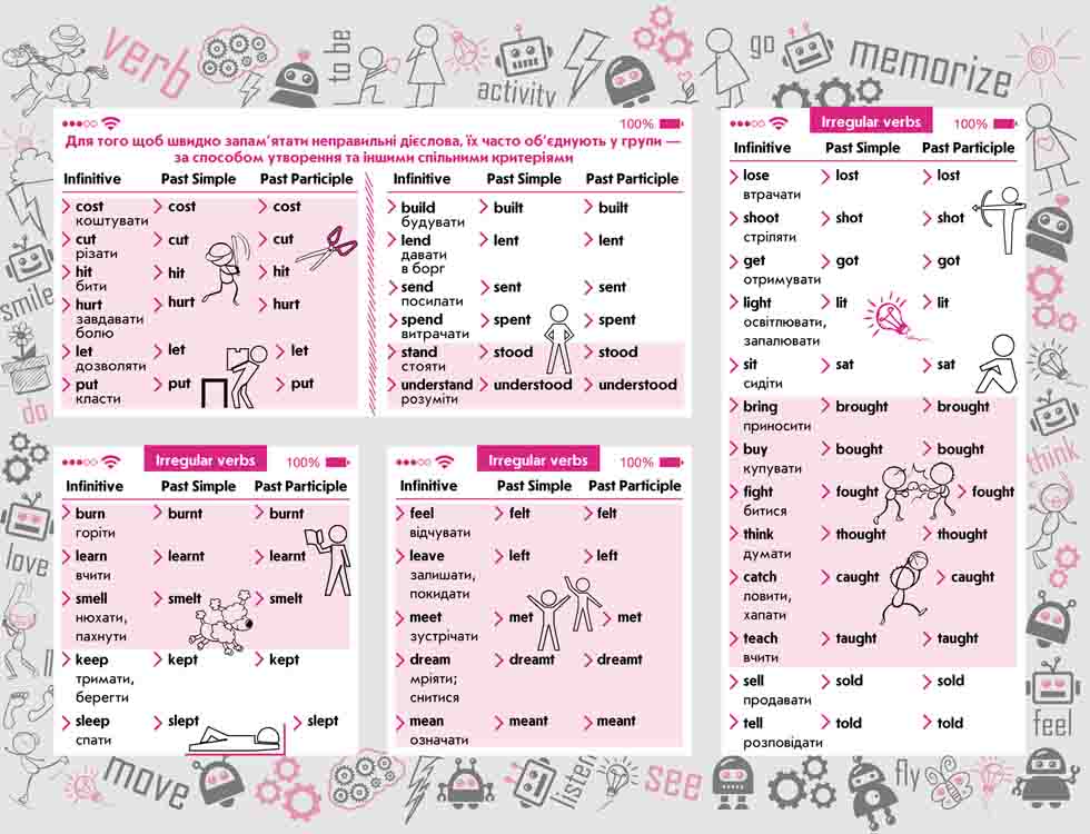 Стікербук містить понад 200 неправильних дієслів! Крім того, на сторінках видання подано інформацію про інфінітивні конструкції, про форми та часи дієслів. Стікербуки — знання, що самі липнуть до учнів!