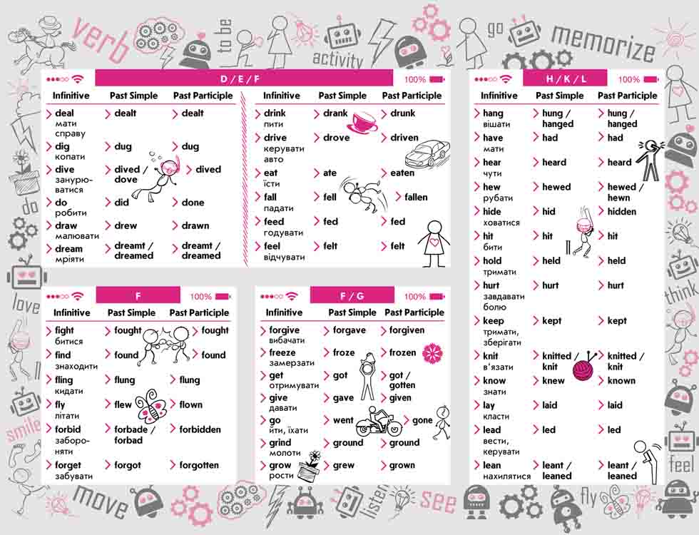 Стікербук пропонує два способи запам’ятовування дієслів: за алфавітом і за особливостями утворення.