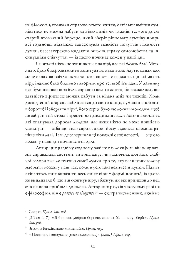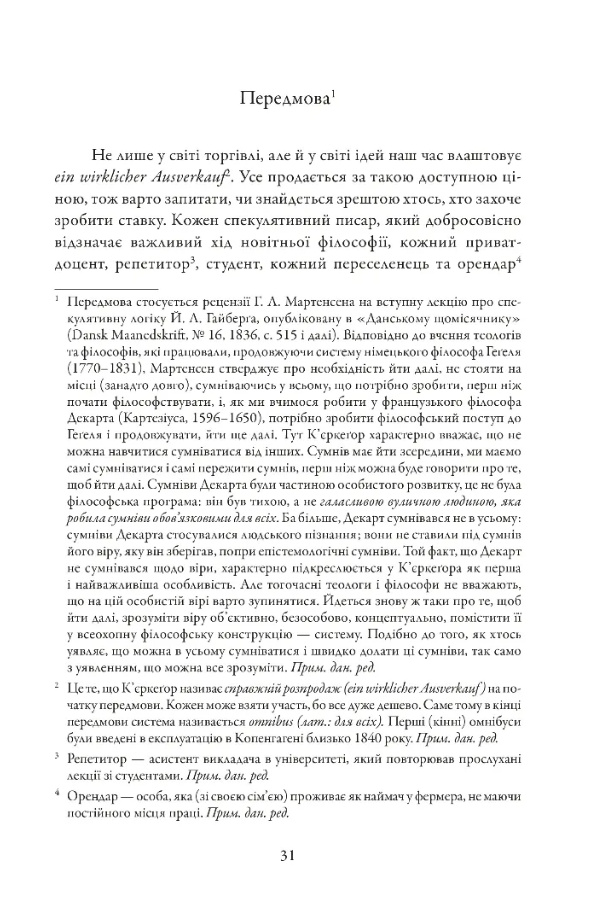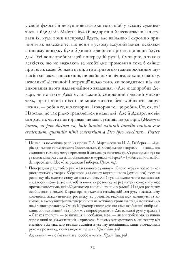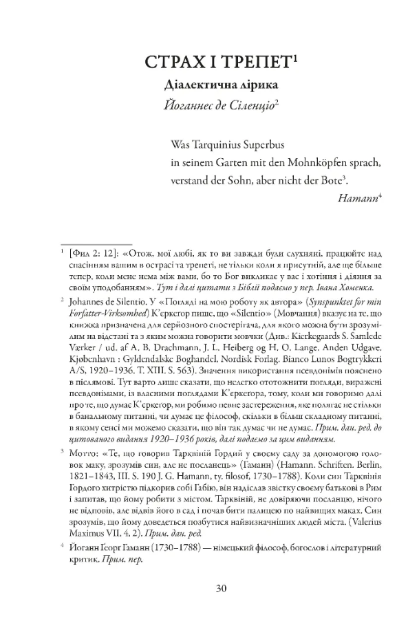 Уперше українському читачеві запропоновано переклад шедевра світового значення, одного з ключових творів відомого данського філософа Сьорена К’єркеґора «Страх і трепет», опублікований 1843 року під псевдонімом Йоганнес де Сіленціо. У творі мислитель всебічно інтерпретує жертвопринесення Ісаака, яке здійснив його батько Авраам, і на тлі цього біблійного сюжету порушує ґрунтовні проблеми моральної філософії та богослов’я, зокрема проблематику Бога й віри, етики й моралі, пристрасне ставлення до віри «Лицаря віри» на противагу «Лицареві нескінченності».