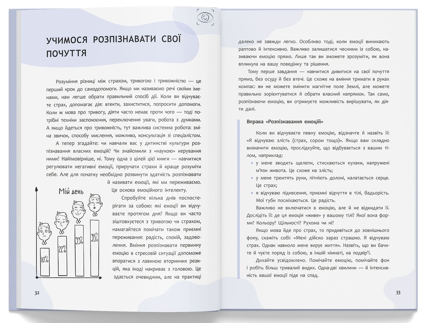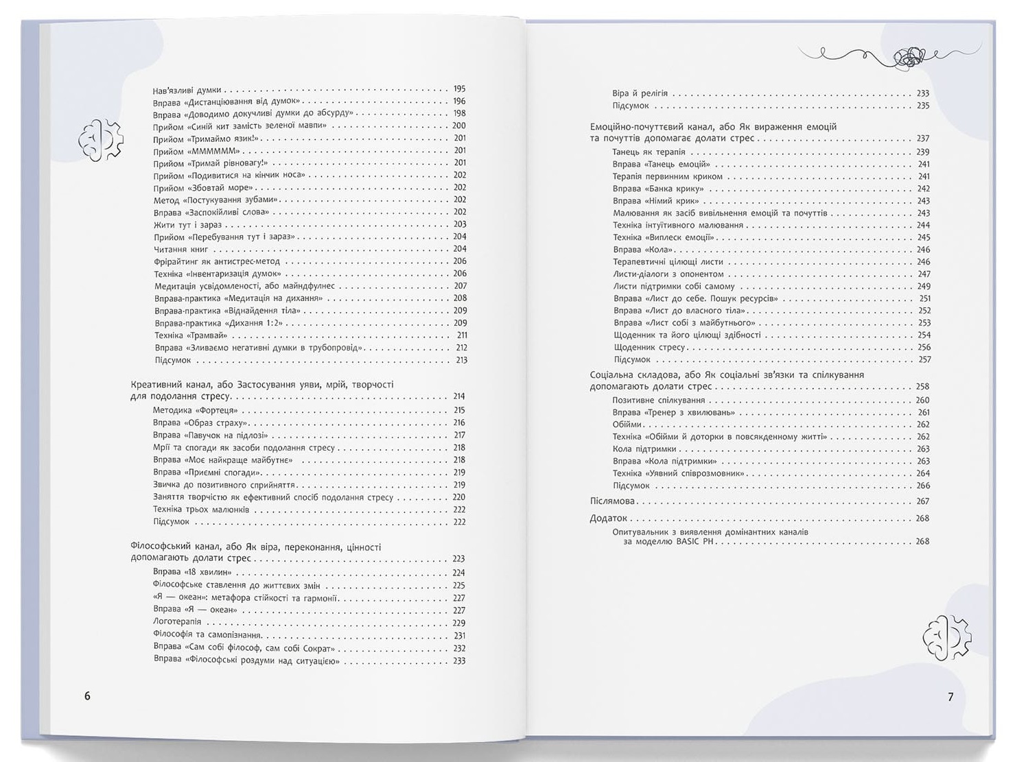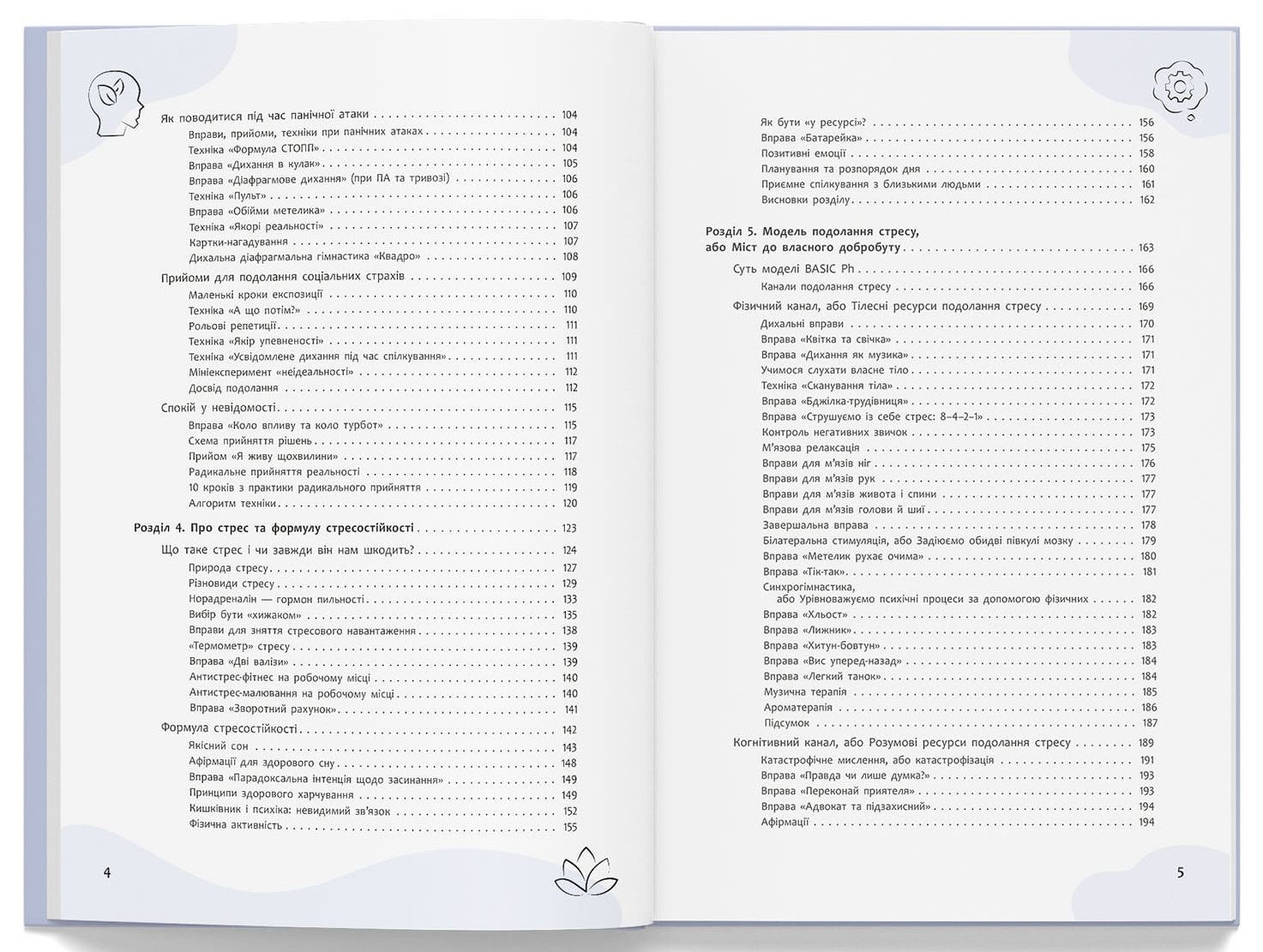У книзі зібрано близько 120 практичних вправ і технік, які допоможуть знизити рівень стресу, впоратися з тривогою та повернути внутрішній спокій. Окремий розділ присвячено методу BASIC Ph — сучасному підходу, що навчає активувати власні ресурси й розвивати стресостійкість навіть у складні часи.