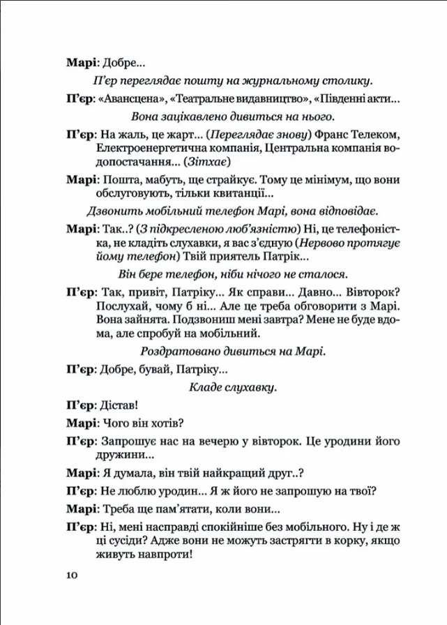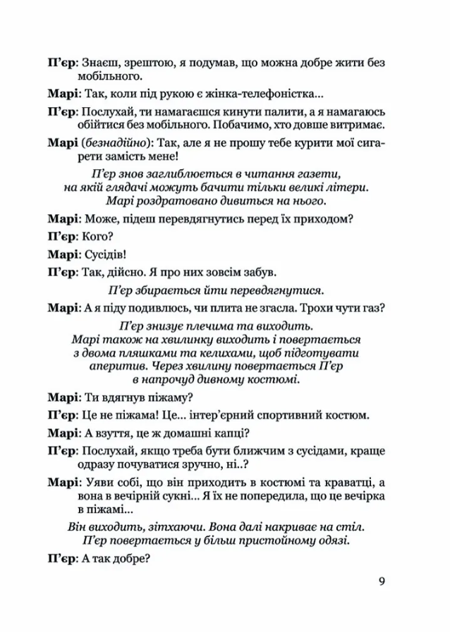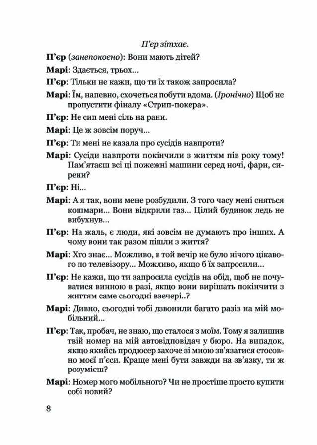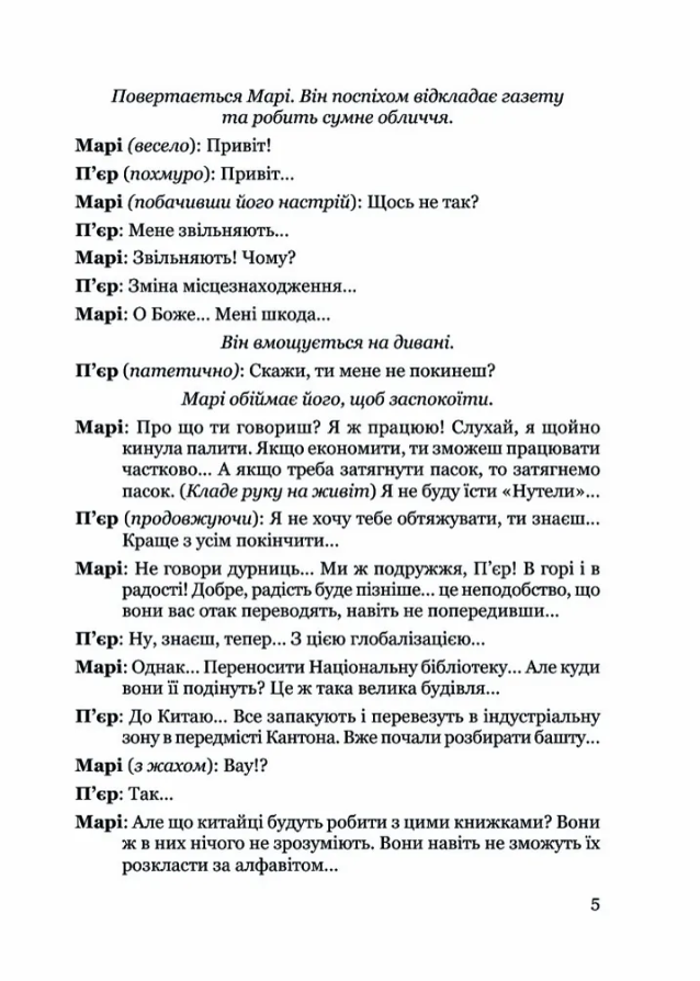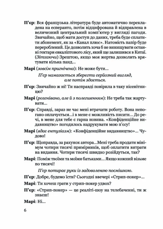 Жан-П’єр Мартінес (Jean-Pierre Martinez), відомий сучасний французький письменник, поет і драматург, а також вчений-семіотик. Він написав декілька романів, близько 100 сценаріїв для телебачення та понад 90 театральних п’єс. Його п’єси були перекладені англійською, іспанською, португальською, німецькою та іншими мовами й багаторазо- во поставлені на сценах не тільки у Франції, а й в інших країнах Європи, Латинської Америки, США й незмінно користуються неабияким успіхом. Чудовий знавець людської душі, Жан-П’єр Мартінес у своїх творах розкриває її потаємні (часом неприємні чи дивні), трагікомічні сторони, завжди з надзвичайною добротою та дотепним гумором, завдяки чому ці п’єси сприймаються глядачем (або читачем) з великою зацікавленістю. Творчість цього непересічного майстра драматургії, на жаль, досі зовсім не була відома в Україні. Ця збірка п’яти його найвідоміших п’єс вперше дає читачам змогу з ними ознайомитися з перспективою представлення їх і на українських театральних підмостках.