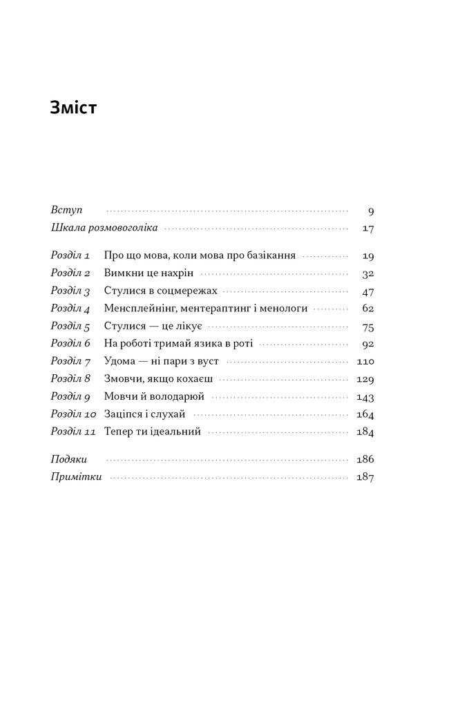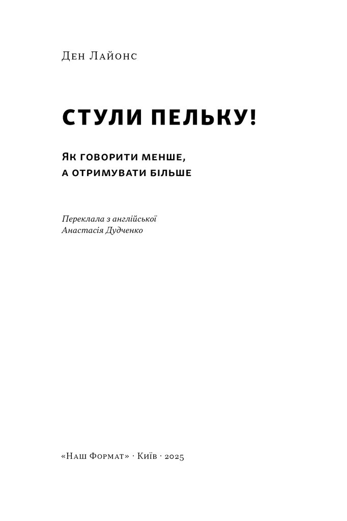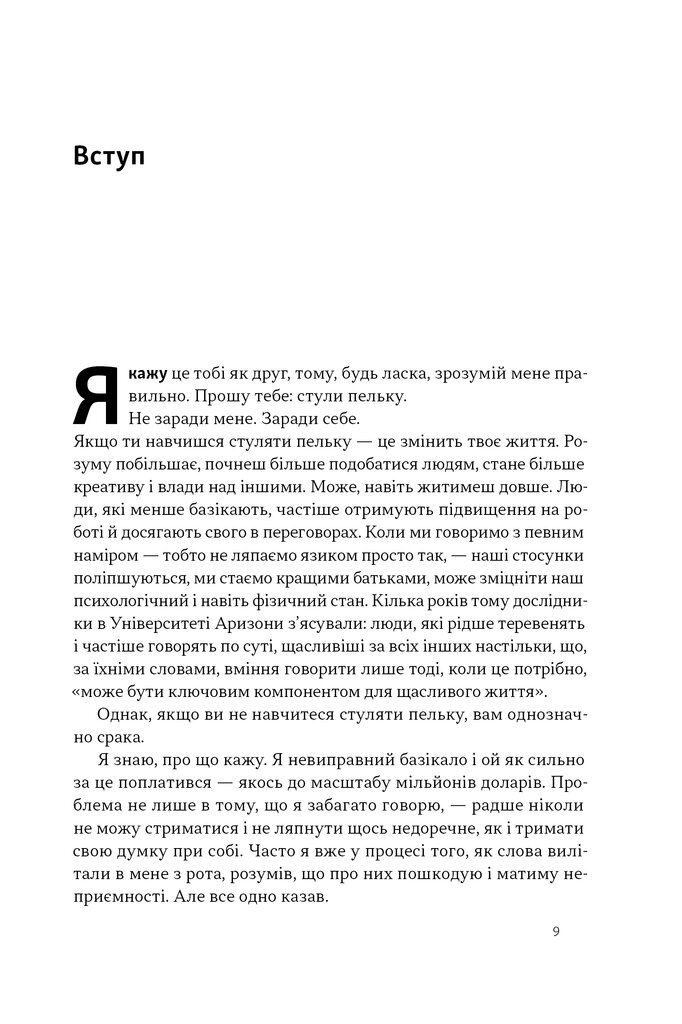 З гумором і спостережливістю він аналізує феномен надмірного базікання та навязливої потреби висловлюватися з приводу й без нього. Чому Байден виграв вибори, коли навчився припинати язика? Чому соцмережі перетворилися на «монологи Гамлета на метамфетаміні»? Як ви можете змінити вашу кар’єру, стосунки й добробут, опанувавши навичку «ні пари з вуст»? У цій книжці ви знайдете відповіді, як використовувати слова свідомо — і стати спокійнішими, продуктивнішими та впливовішими.