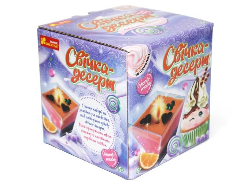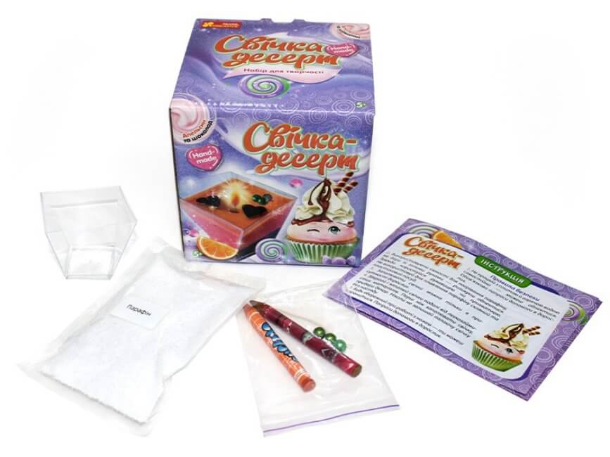 Створи свічку-десерт своїми руками! За допомогою цього набору для творчості не тільки розкриєш секрети виготовлення гелевих свічок, а й прикрасиш свій будинок! Казкова свічка у вигляді солодощів стане незвичайним подарунком для маленьких та дорослих ласунів. У цьому наборі ти знайдеш все необхідне для створення чудової свічки.