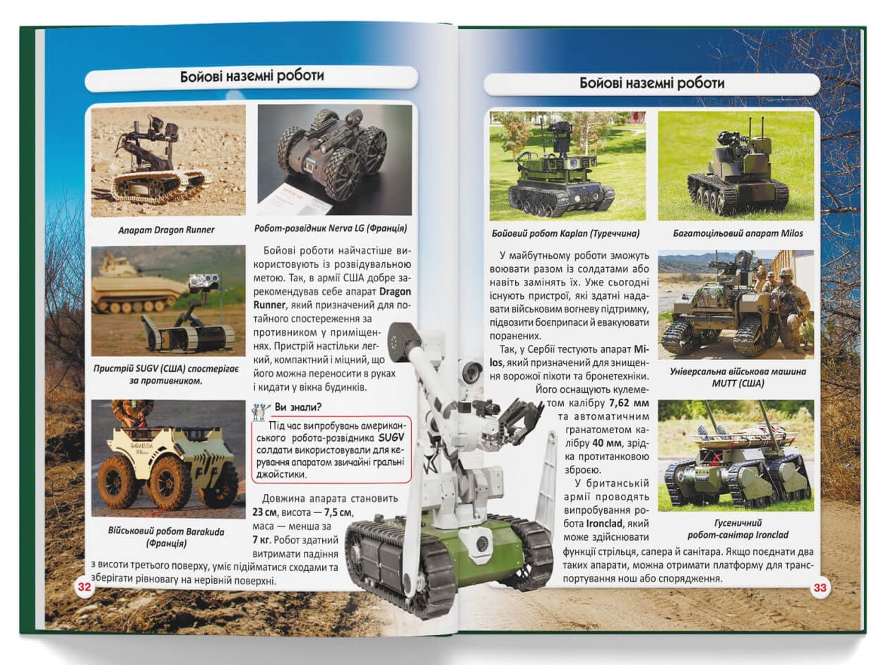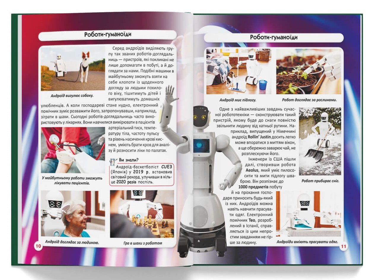 Чи зможуть роботи в майбутньому відчувати й мислити, як люди, чи вони здатні тільки сприймати й виконувати запрограмовані команди? Відповідь на це запитання допоможе одержати книжка, яку ви тримаєте в руках. Вона познайомить зі світом розумних машин у всьому його розмаїтті, починаючи з андроїдів і закінчуючи сучасними пристроями для дослідження космічного простору. Цікаві факти зроблять процес читання ще захопливішим, а яскраві ілюстрації дозволять скласти більш повне уяв- лення про роботизовані механізми.