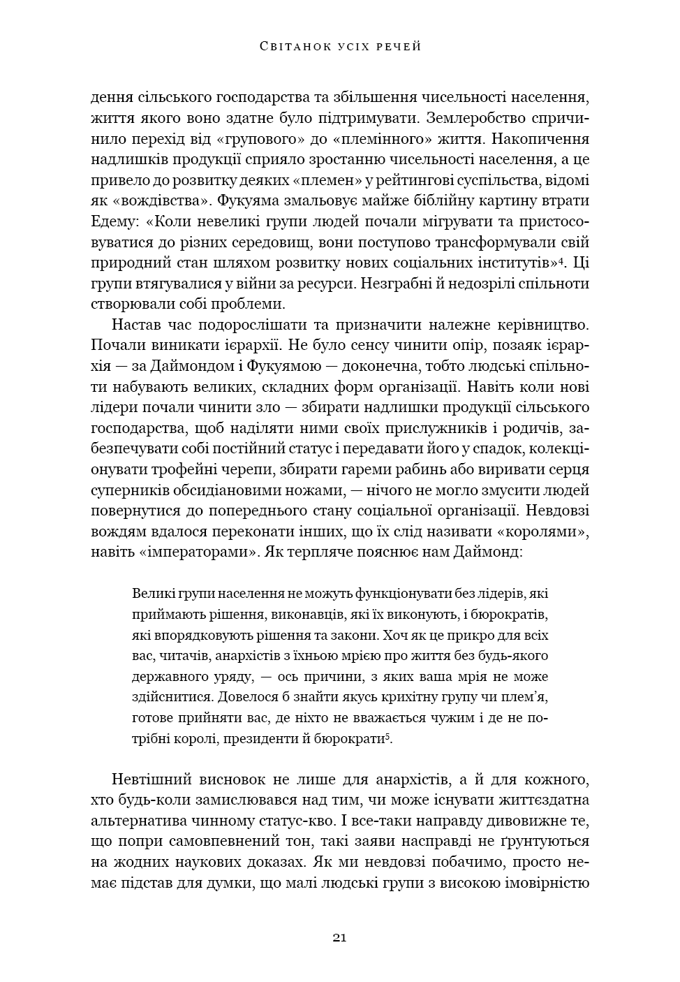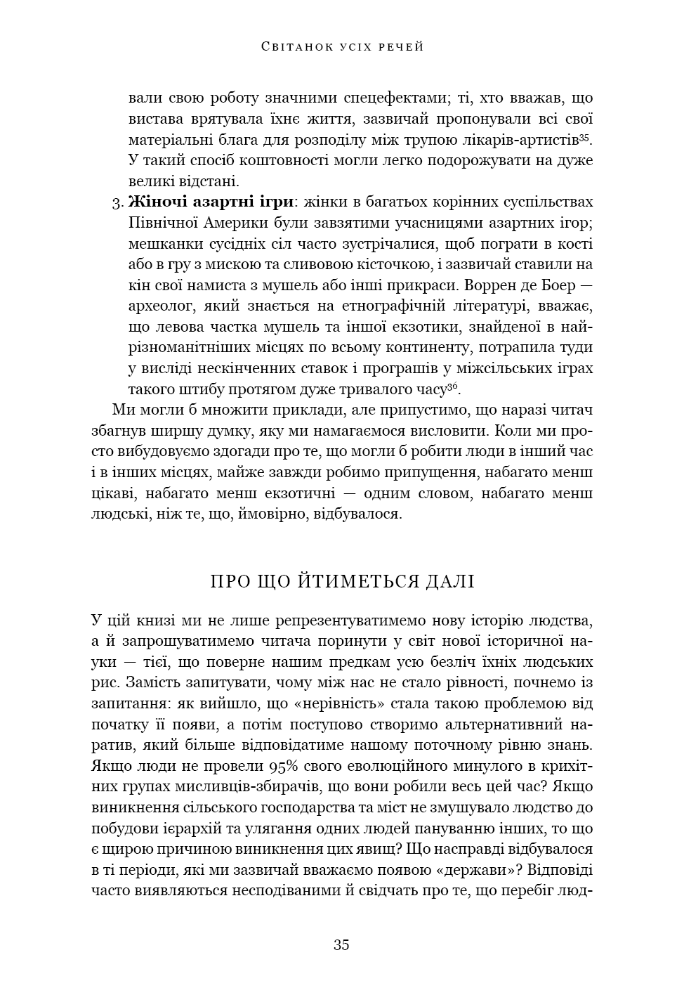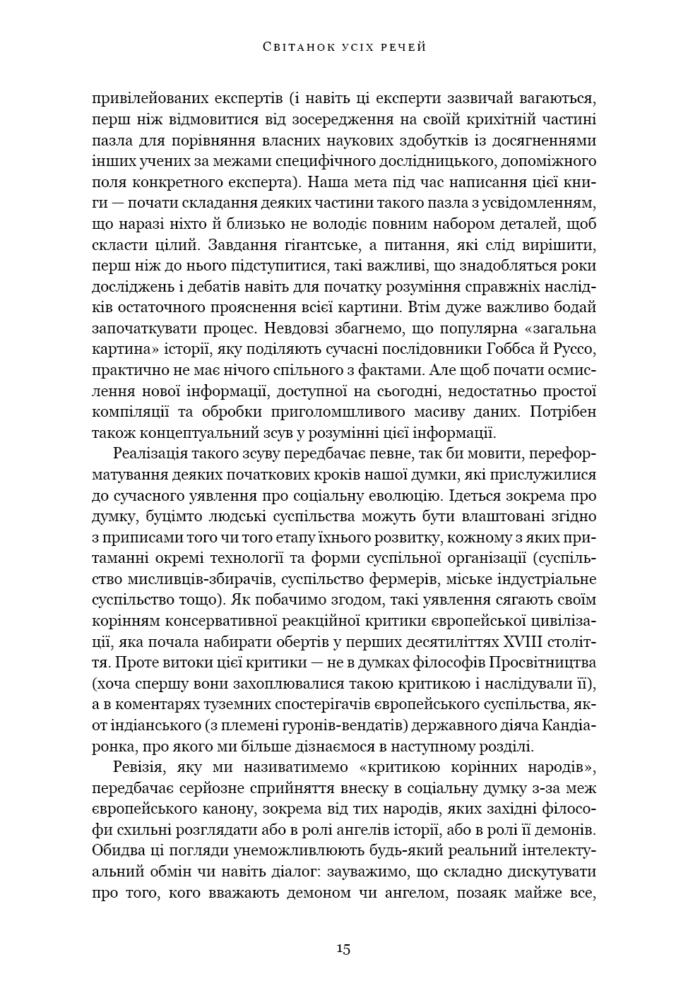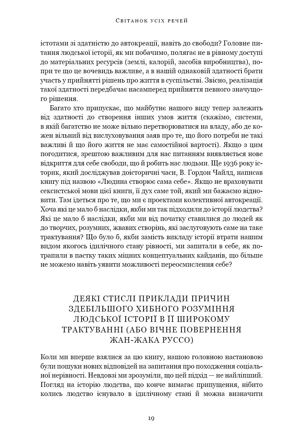 «Світанок усіх речей» — ґрунтовний аналіз досліджень останніх кількох десятиліть, що пропонує кардинально новий погляд на історію людства. Книга кидає виклик нашим найфундаментальнішим уявленням про соціальну еволюцію — від розвитку сільського господарства й міст до походження держави, демократії та нерівності — і відкриває нові можливості для розуміння природи людини. Спираючись на новаторські дослідження в археології та антропології, автори показують, як змінюється історія, коли ми отримуємо змогу скинути концептуальні кайдани й вільно сприймати те, що було насправді.