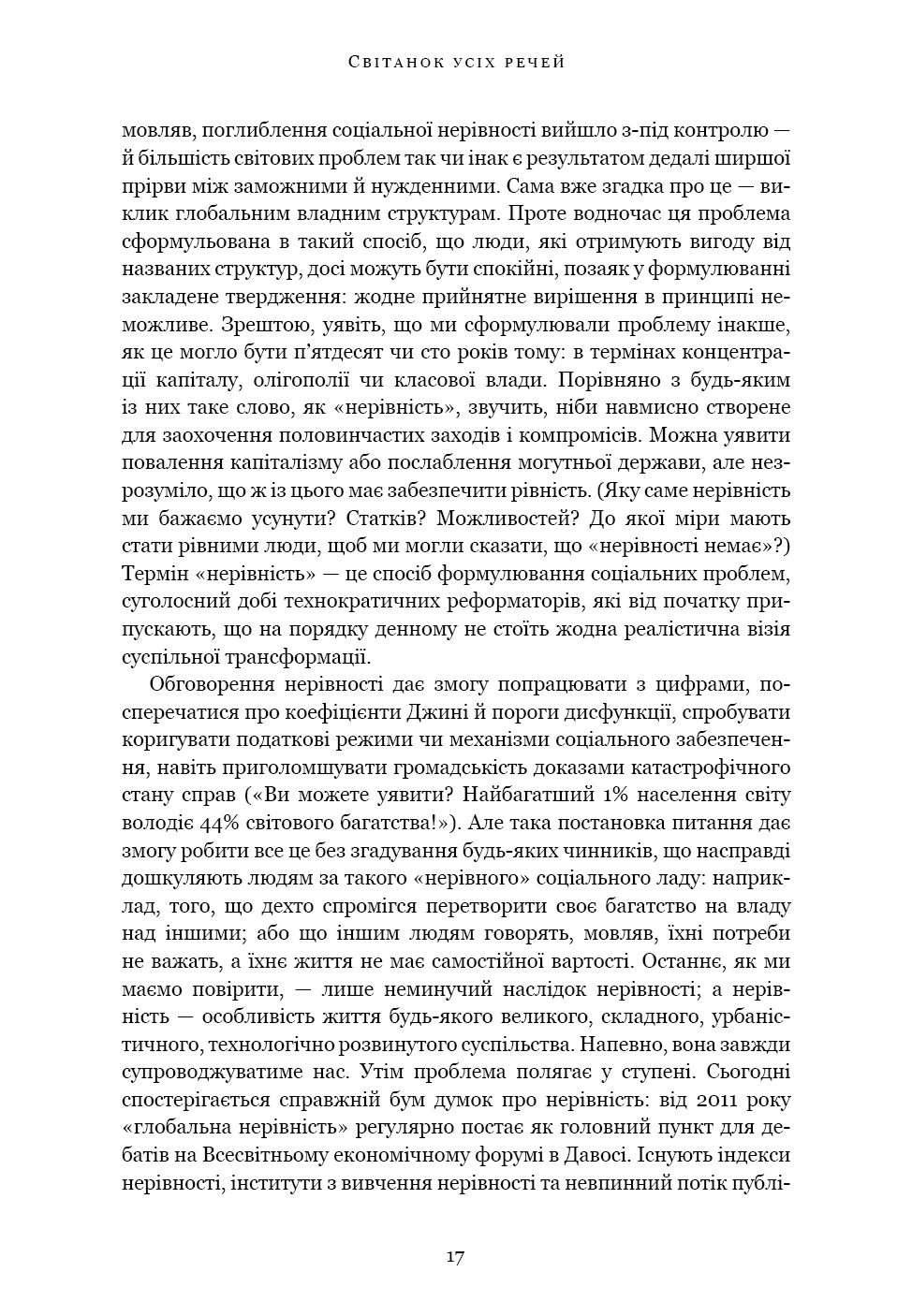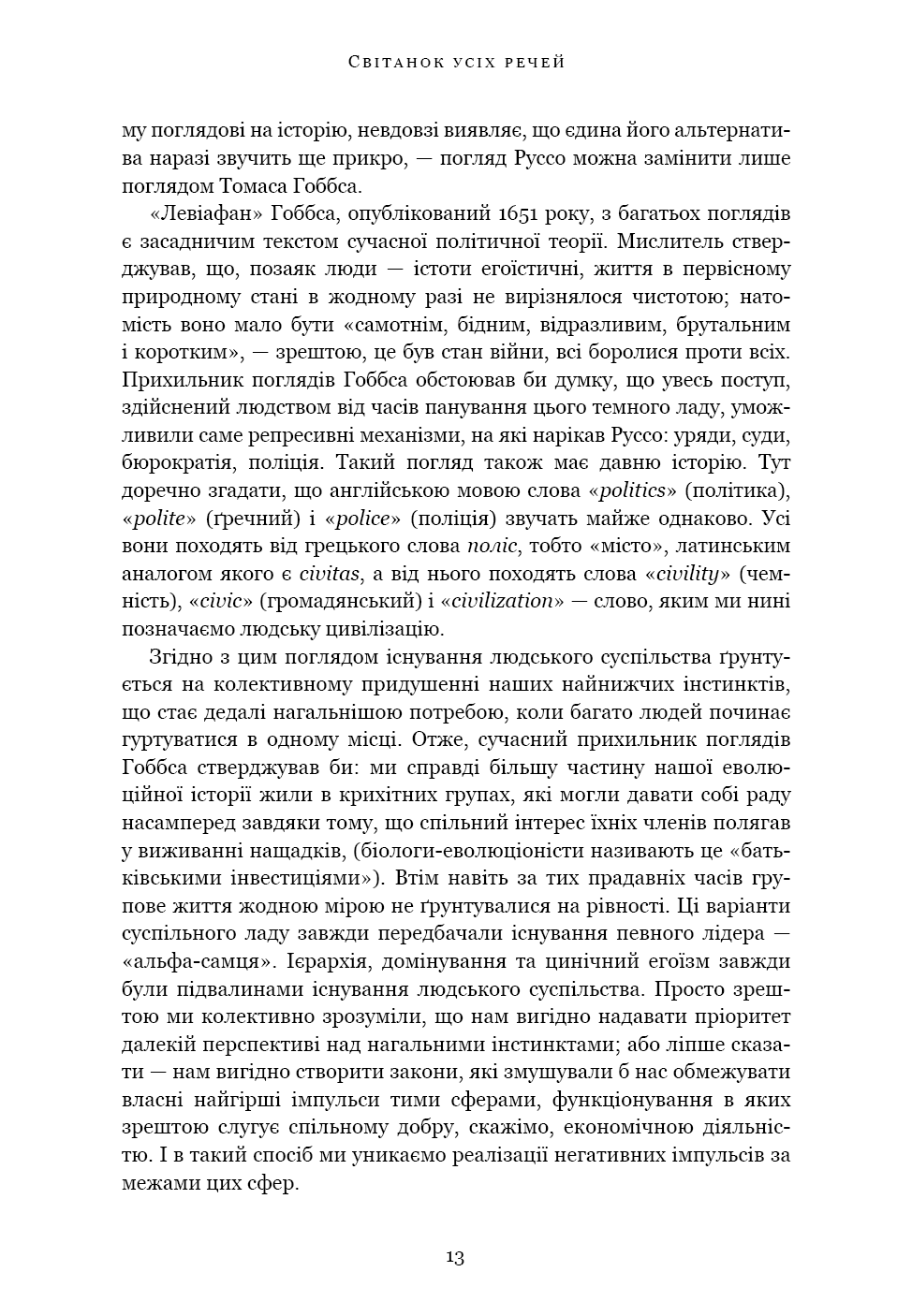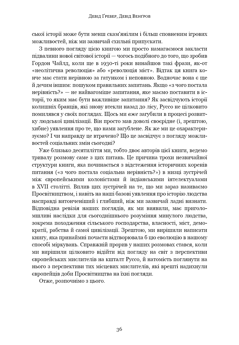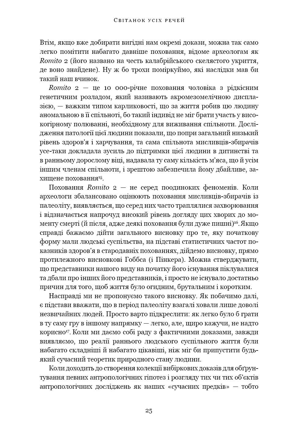 «Світанок усіх речей» — ґрунтовний аналіз досліджень останніх кількох десятиліть, що пропонує кардинально новий погляд на історію людства. Книга кидає виклик нашим найфундаментальнішим уявленням про соціальну еволюцію — від розвитку сільського господарства й міст до походження держави, демократії та нерівності — і відкриває нові можливості для розуміння природи людини. Спираючись на новаторські дослідження в археології та антропології, автори показують, як змінюється історія, коли ми отримуємо змогу скинути концептуальні кайдани й вільно сприймати те, що було насправді.