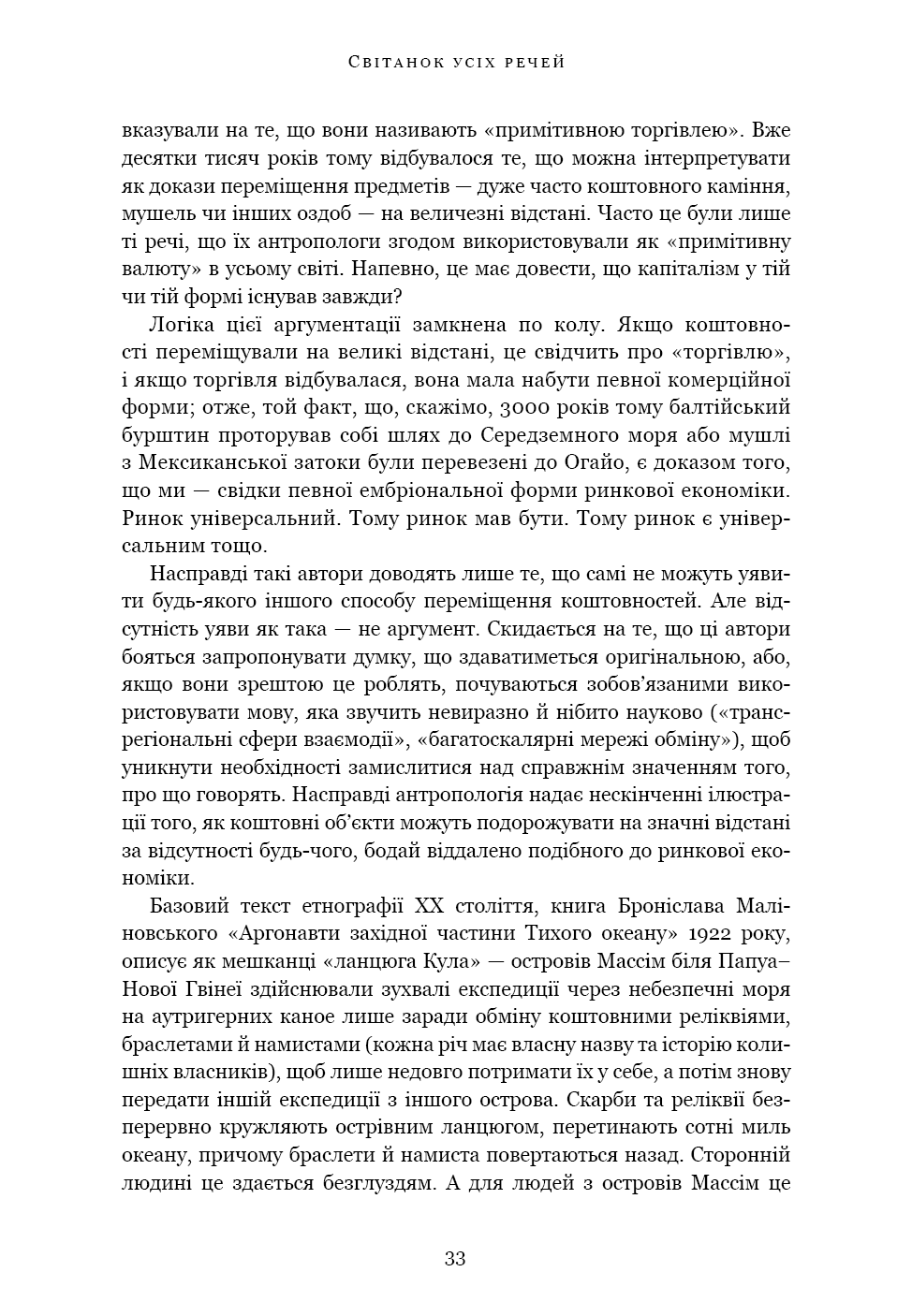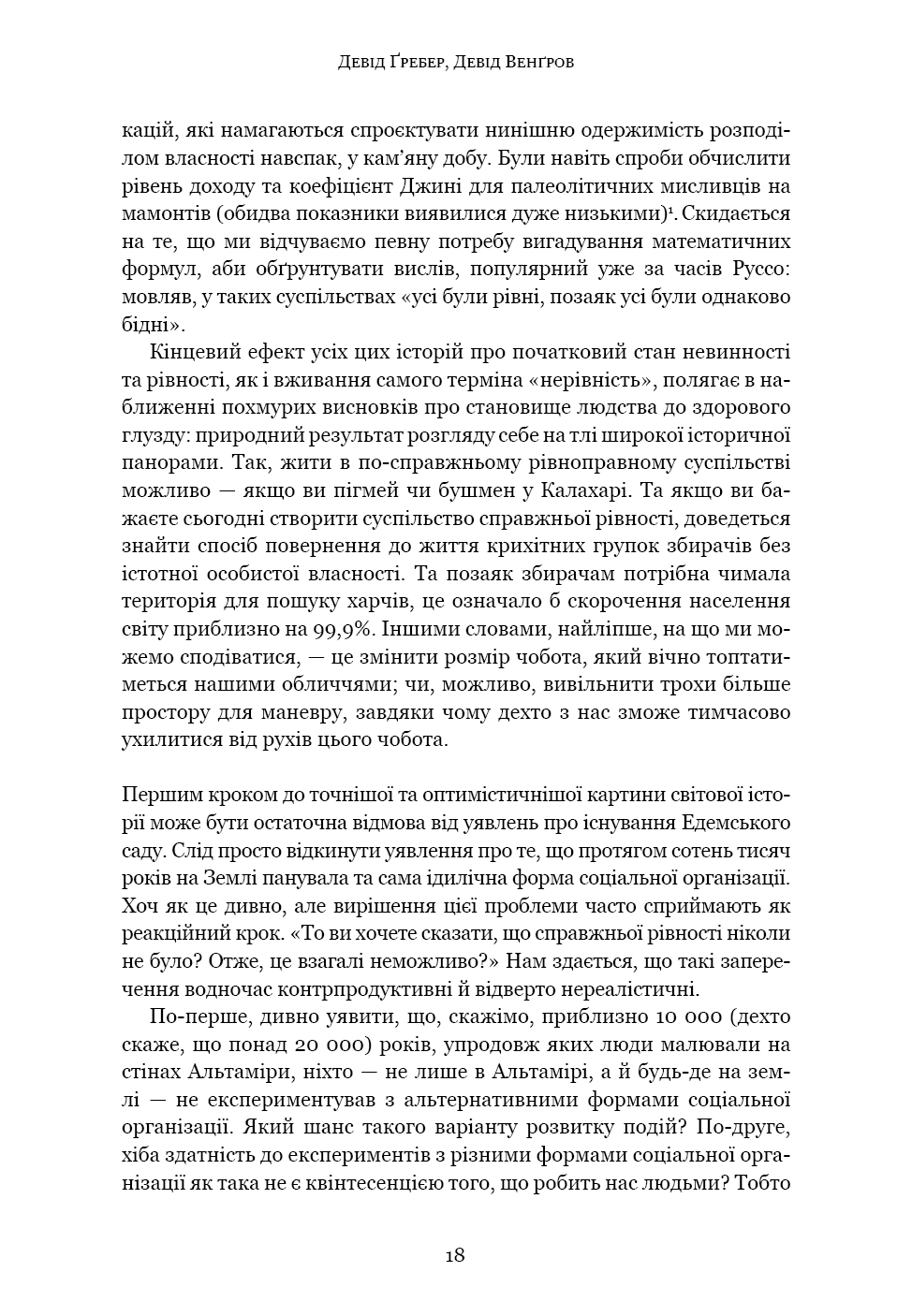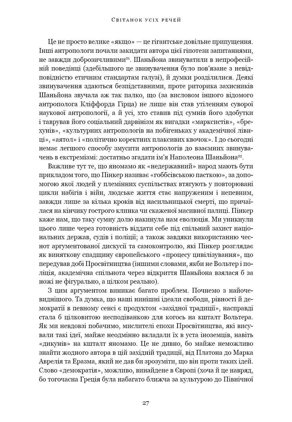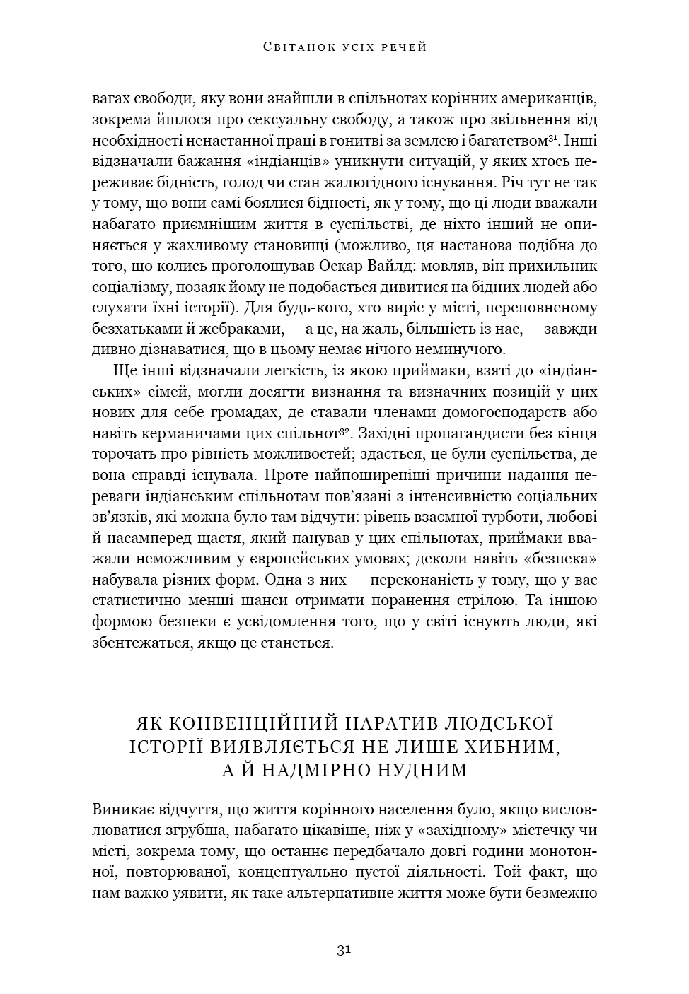 «Світанок усіх речей» — ґрунтовний аналіз досліджень останніх кількох десятиліть, що пропонує кардинально новий погляд на історію людства. Книга кидає виклик нашим найфундаментальнішим уявленням про соціальну еволюцію — від розвитку сільського господарства й міст до походження держави, демократії та нерівності — і відкриває нові можливості для розуміння природи людини. Спираючись на новаторські дослідження в археології та антропології, автори показують, як змінюється історія, коли ми отримуємо змогу скинути концептуальні кайдани й вільно сприймати те, що було насправді.