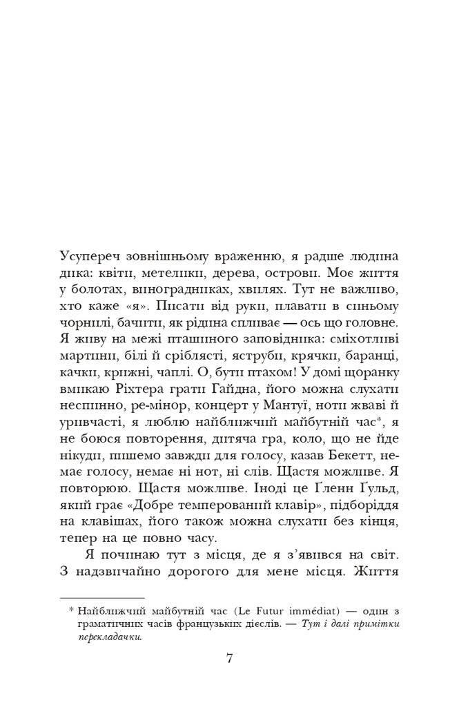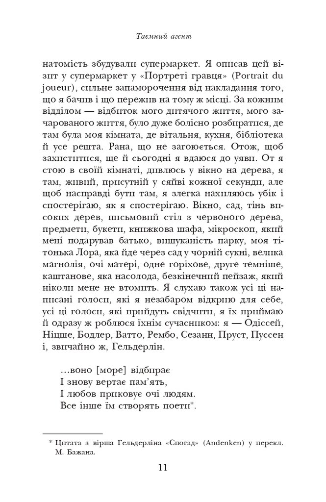Останній роман великого автора. Дуже французька книжка й водночас космополітична. Ода життю та його вишуканим інтелектуальним насолодам. У долі та творчості Філіппа Соллерса – письменника, редактора, критика, індивідуаліста, парадоксального та дивовижного провідця – є магія. Магія, народжена з його пристрасті до літератури, поезії, природи та музики, до романтичних зустрічей, до мистецтва таємниці та інтимності. Вражає перелік постатей, які, наче у чорно-білій кінострічці, з'являються мов спалахи і знову зникають у темряві: Лакан, Селін, Барт, Бретон, Батай, Мальро, Рембо, Фуко, Арагон – друзі, протилежності, антагоністості. Хтось просто п’є каву з автором, хтось перечається, хтось надихає, ба більше – впливає на його долю і змінює її, і впливає на цей взаємний. І, звичайно, жінки, непрості стосунки з ними. Улюблена дружина Юлія Крістева, муза і візаві у полеміці; Домінік Ролен – «п'ятдесят років божевільного кохання» і щоденного листування...