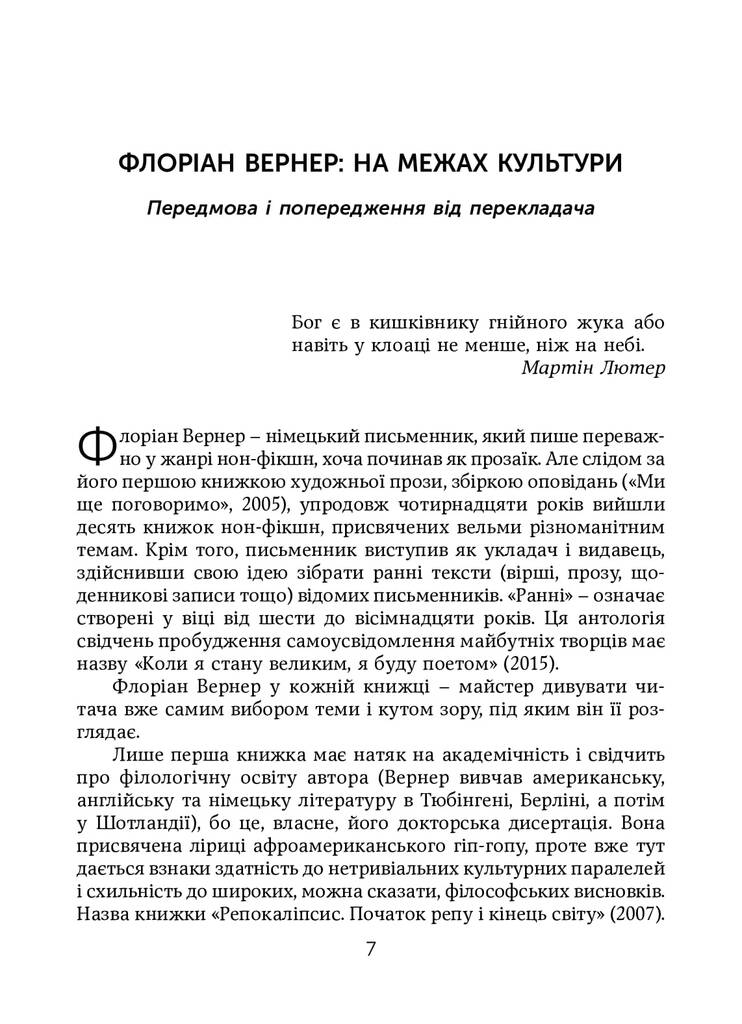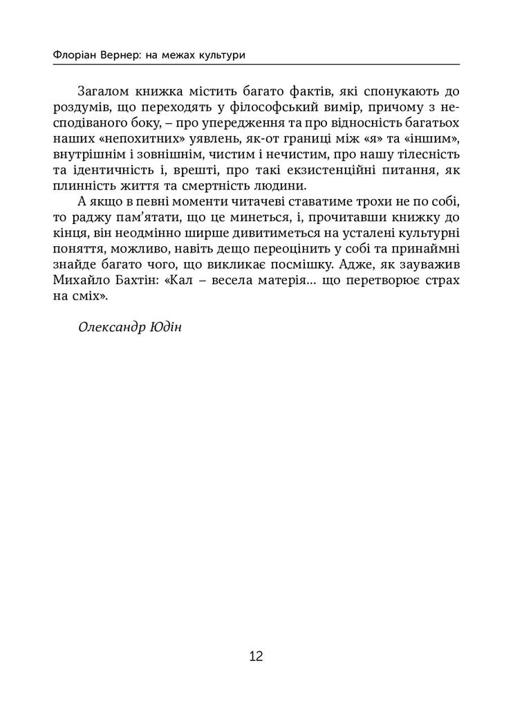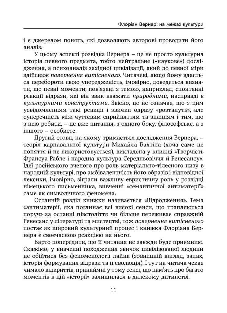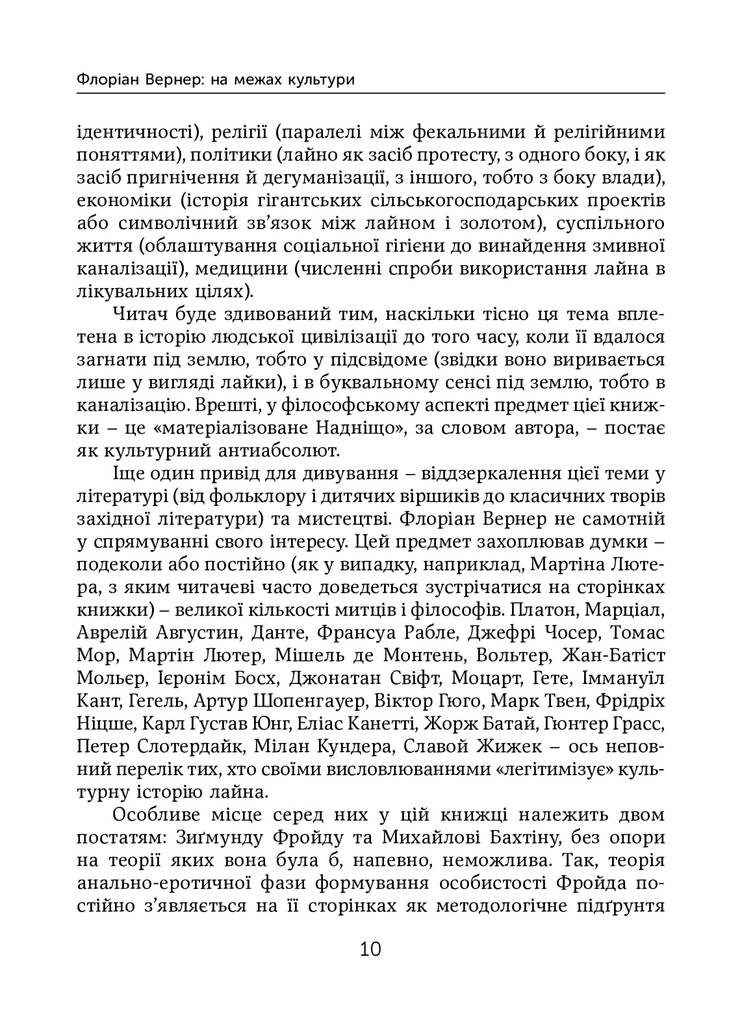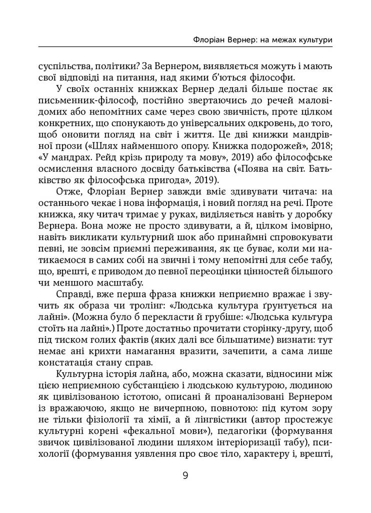 Існують теми, про які не говорять вголос. Існують речі, про які не годиться згадувати, принаймні у шляхетному товаристві, на які суспільною мораллю накладено беззаперечне табу. До них належать, із-поміж іншого, продукти життєдіяльності живих істот, простіше кажучи, лайно. Але це не табу для Флоріана Вернера, який взявся розглянути делікатну тему під кутом зору історії розвитку людської культури, яка, на його думку, ґрунтується на… лайні. Не тільки в тому сенсі, що наші міста як утілення новочасної цивілізації вивищуються над гігантськими каналізаційними мережами. Не тільки тому, що наш обмін речовин, а з ним і наше життя без виділення екскрементів були б неможливі. А тому, що ми лише через відділення від лайна знаємо, що таке взагалі культура. Без тіні немає світла, без бруду немає чистоти. Нам потрібне певне некультивоване супротивне, аби бути в змозі усвідомити себе як цивілізовану істоту. Нам потрібне лайно, аби, прибравши його, утвердитись у своїй культурності. Лайно є неодмінним для нашого саморозуміння.