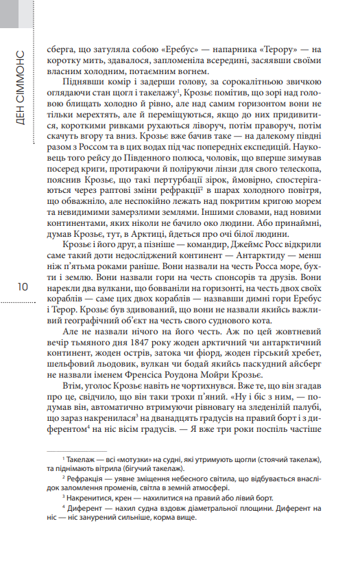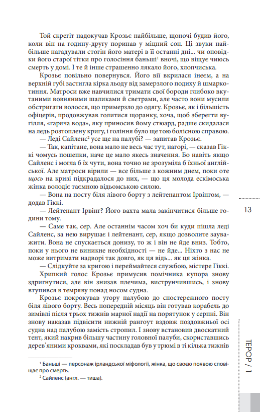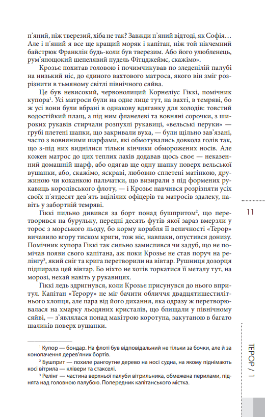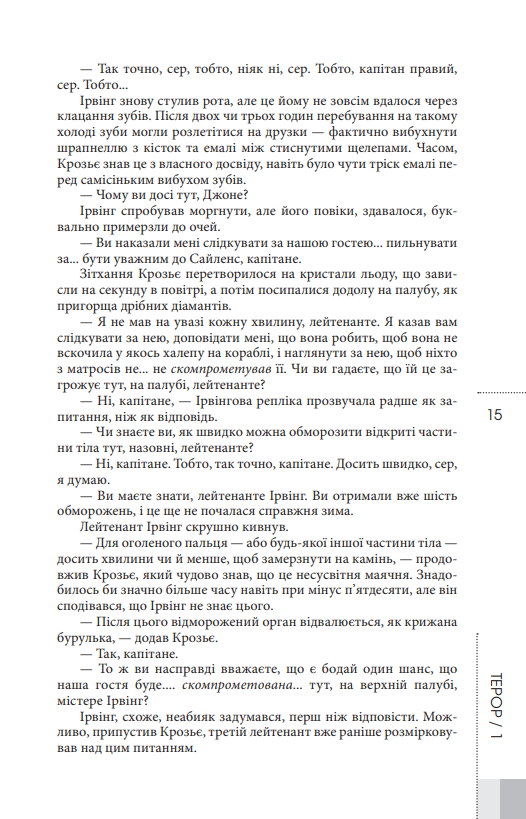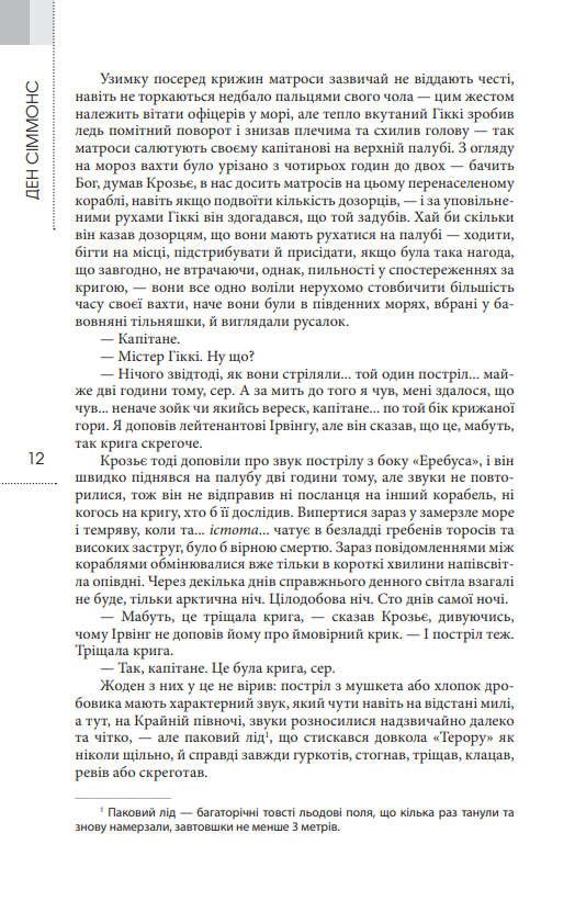 Ден Сіммонс написав роман надзвичайної епічної сили у призабутому нині напрямі літератури про героїчне протистояння людини і сліпої, могутньої та жорстокої природи. Хтось знайде тут аналогії з «Мобі Діком» Германа Мелвілла, комусь цей твір нагадає жорсткішу й похмурішу версію оповідань Джека Лондона про північ, проте це будуть лише досить приблизні аналогії, які цілковито розвіюються при першому ж знайомстві з цим романом. У процесі роботи над «Терором» Ден Сіммонс довго та ретельно опрацьовував архіви, у результаті чого під час читання роману виникає відчуття присутності серед героїв реальної експедиції двох кораблів Королівського флоту Великобританії – «Еребуса» і «Терору», які 1845 року покинули рідний порт у пошуках Північно-Західного проходу через Північний Льодовитий океан. Кораблі так і не повернулися, і Сіммонс водночас з детальним описом експедиції подає своє бачення причин її фіаско.