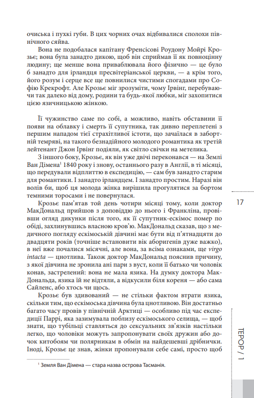 Північ, лютий холод і не менш дошкульний голод, а також смерть від надприродного чогось, яка повсякчас чаїться десь поряд, раз у раз забираючи життя учасників експедиції. На тлі у буквальному сенсі смертельно-прекрасних пейзажів півночі відбувається боротьба з байдужою і жорстокою до людини природою, боротьба з чимось невідомим, чого не можуть спинити ані рушниці, ані найлютіші бурі північної зими, врешті-решт, боротьба одне з одним, адже, як відомо з давніх-давен, людина – найстрашніший і найжорстокіший звір.